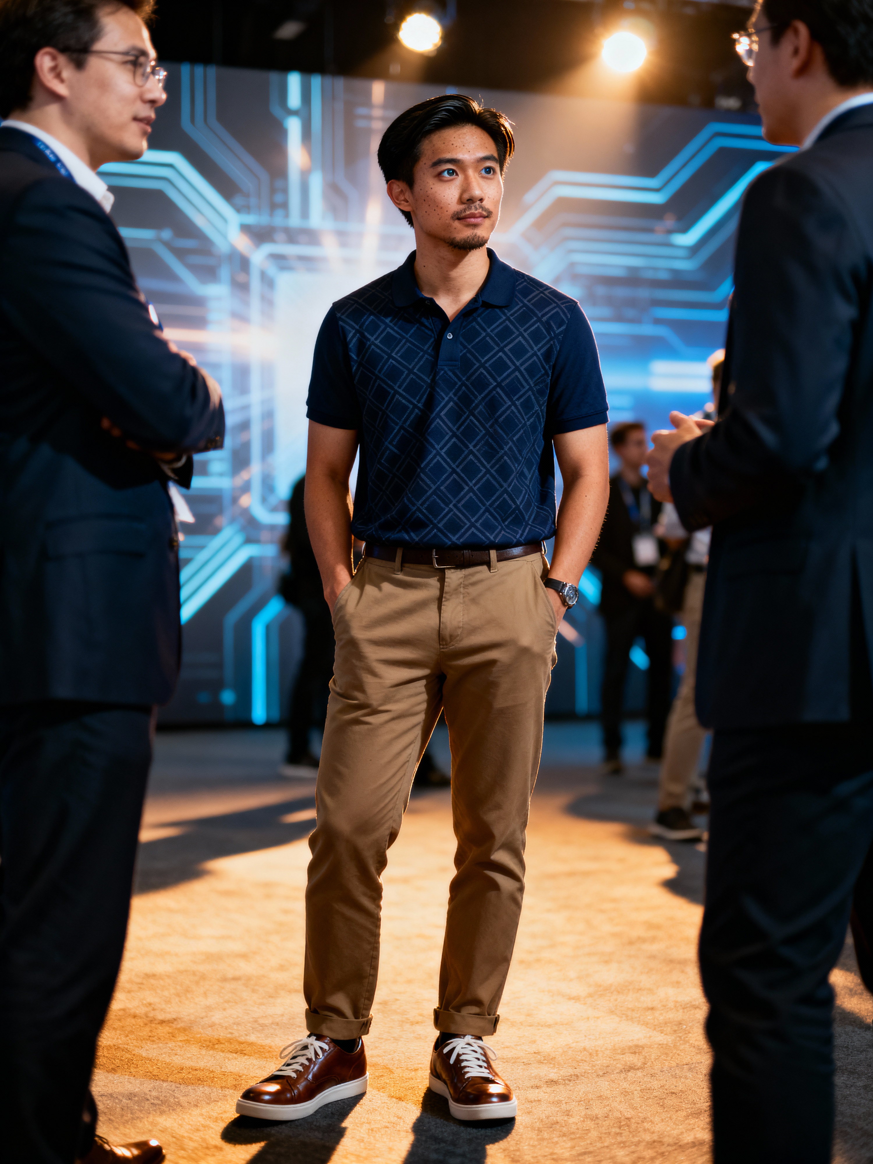 determined model wearing tech-casual polo and chinos networking at a tech conference, professional casual attire, engaged in conversation