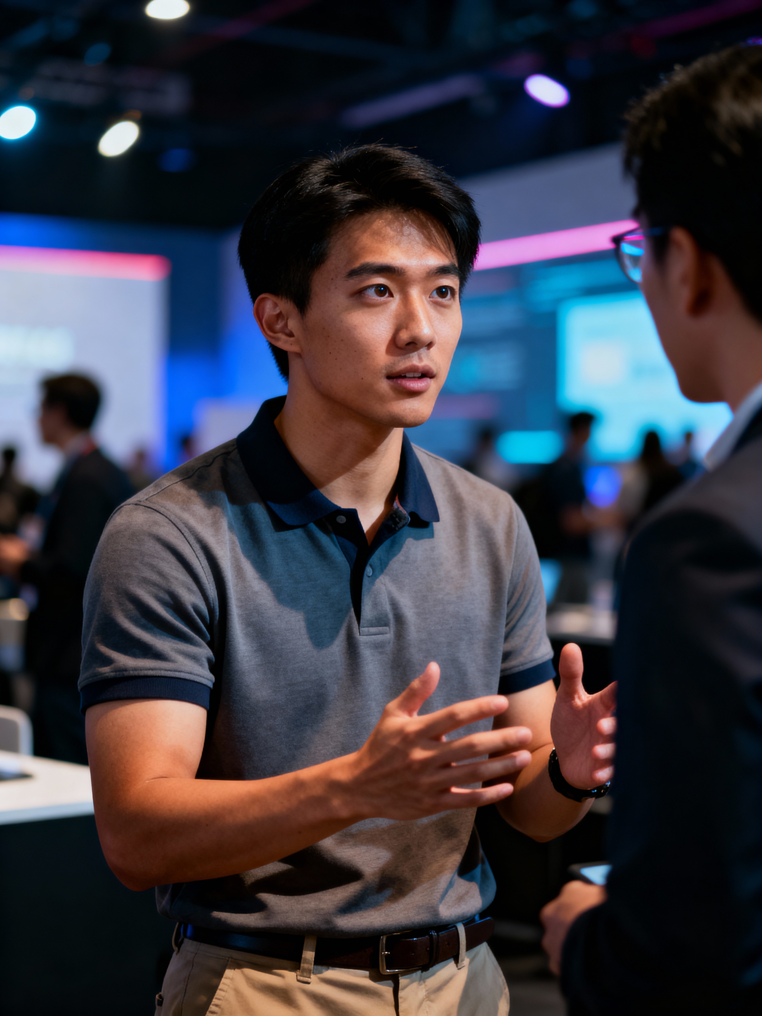 determined model wearing tech-casual polo and chinos networking at a tech conference, professional casual attire, engaged in conversation