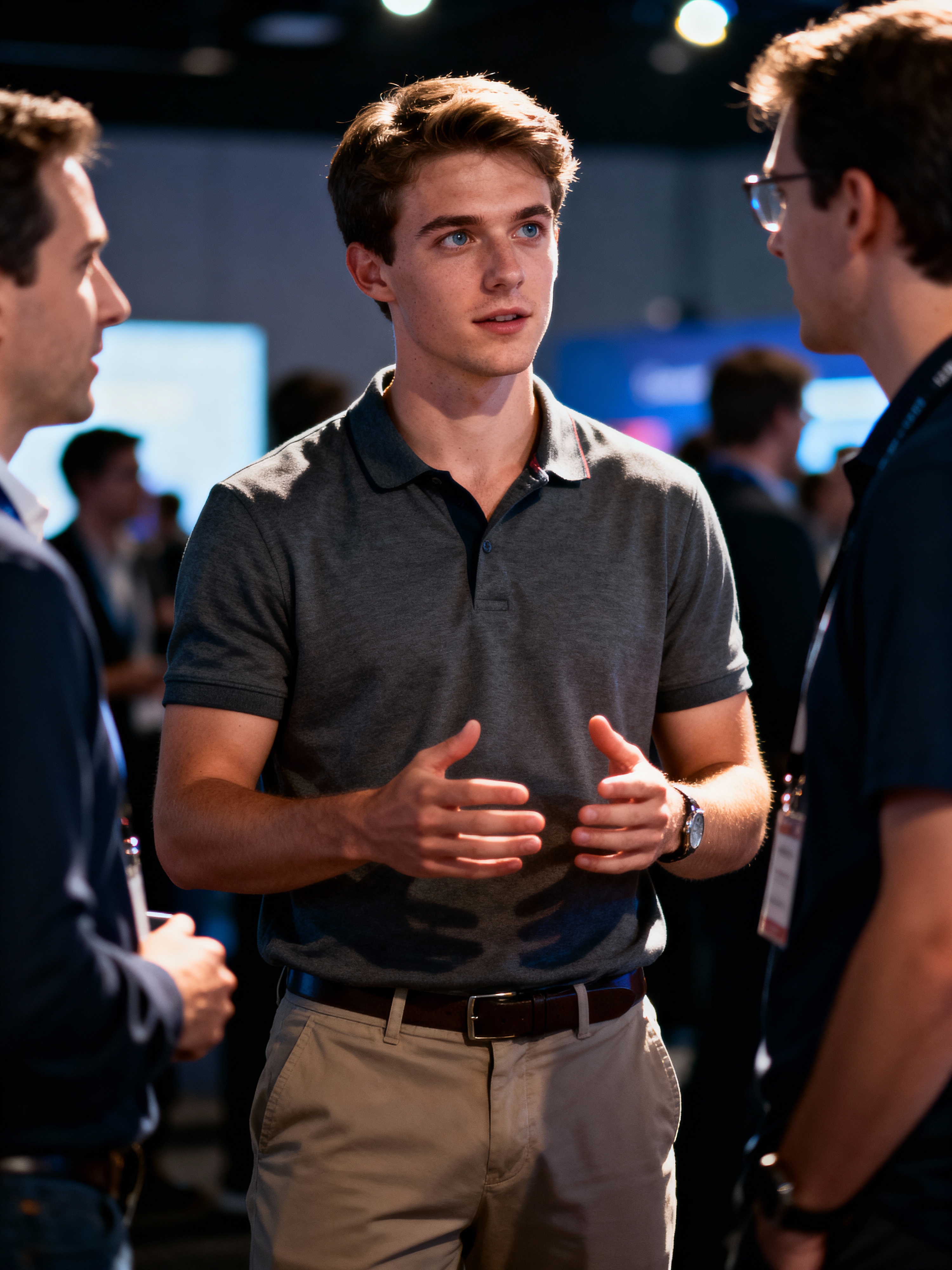 determined model wearing tech-casual polo and chinos networking at a tech conference, professional casual attire, engaged in conversation
