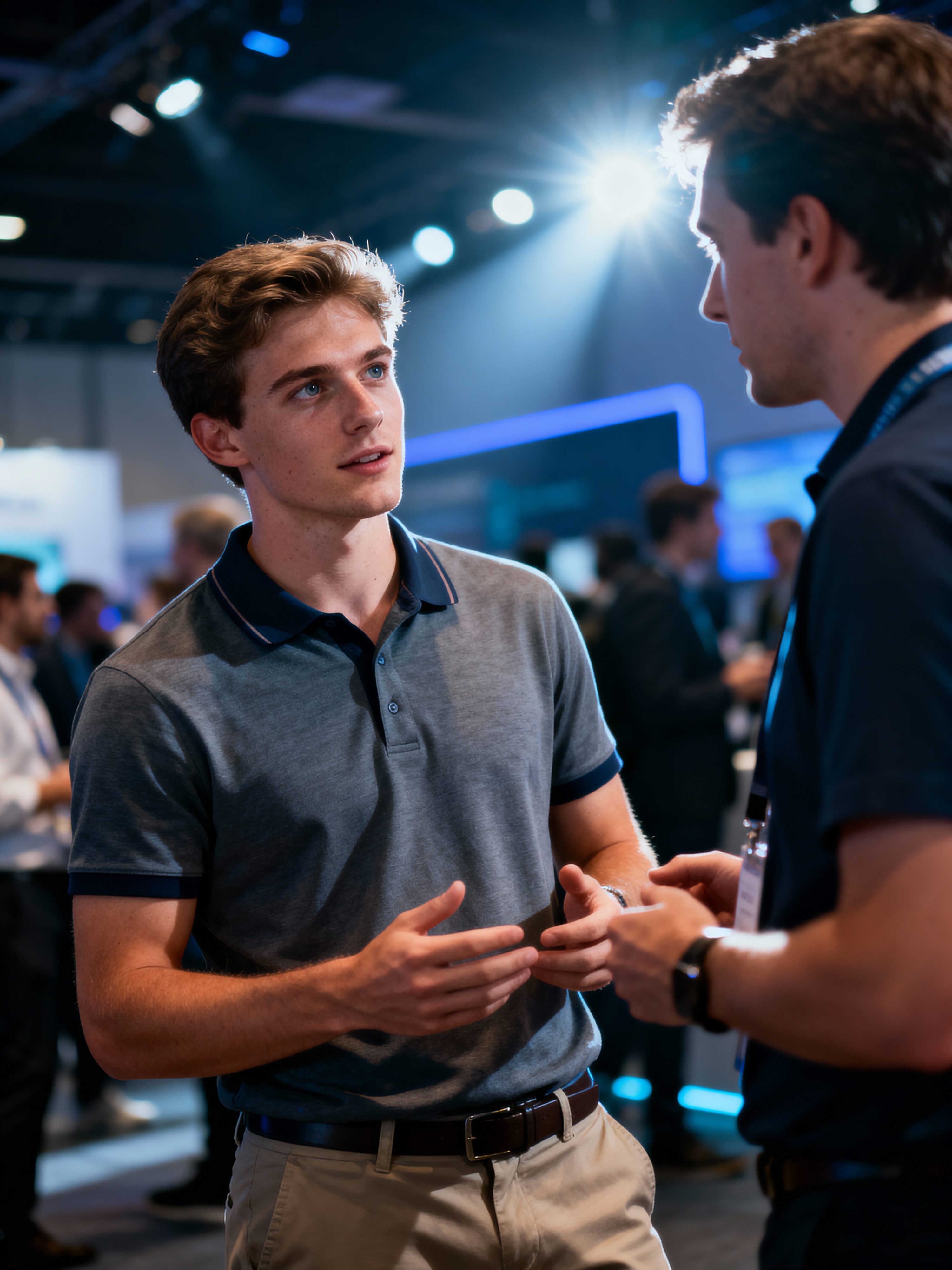 determined model wearing tech-casual polo and chinos networking at a tech conference, professional casual attire, engaged in conversation