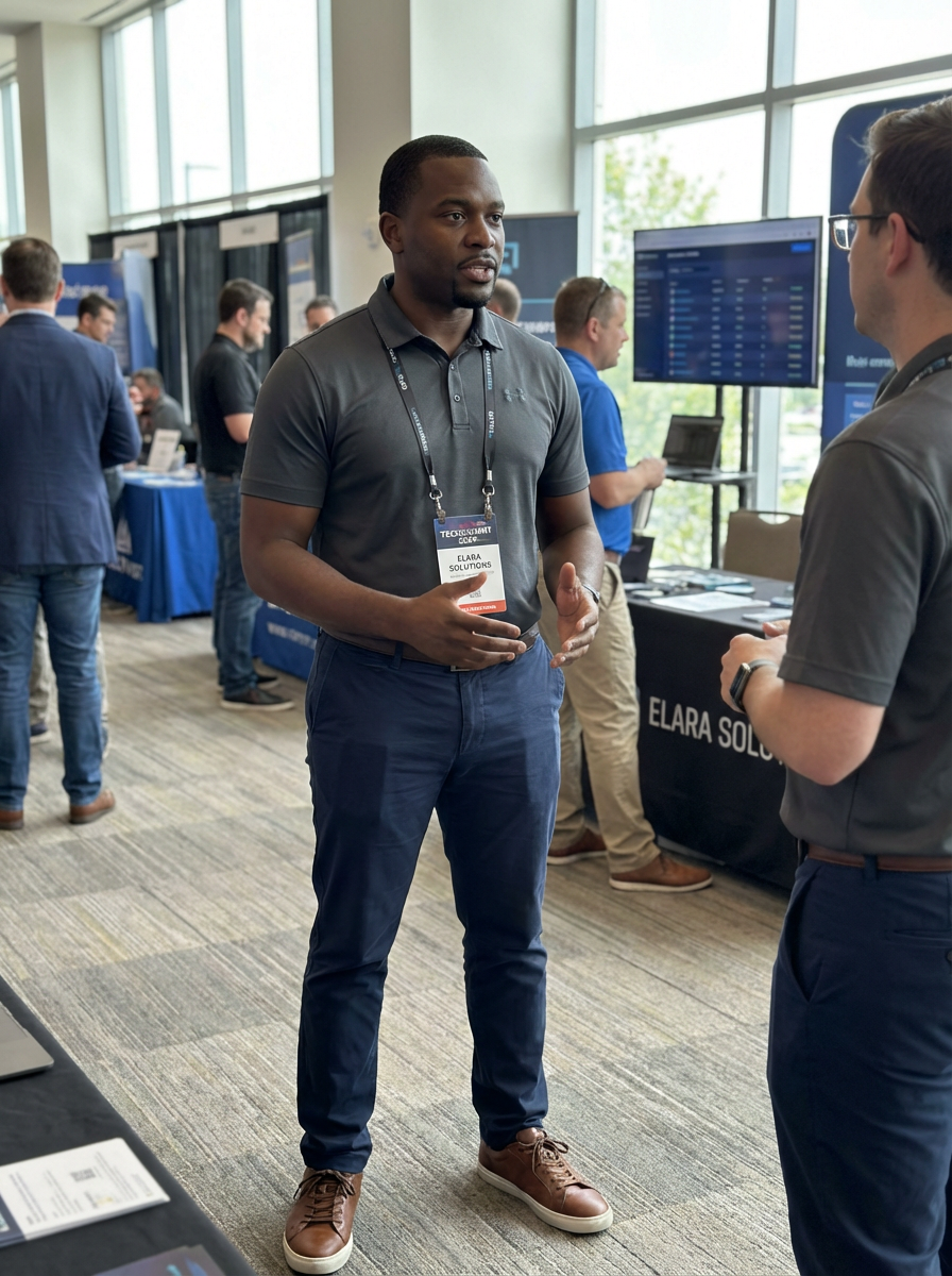 determined model wearing tech-casual polo and chinos networking at a tech conference, professional casual attire, engaged in conversation