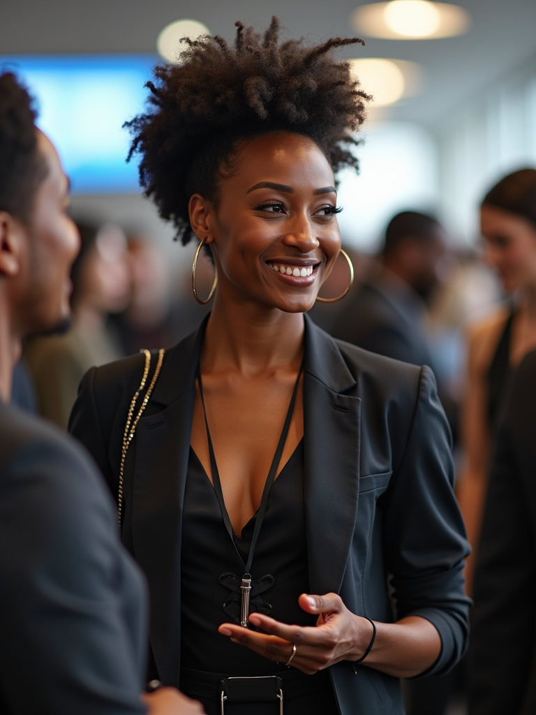 determined model wearing contemporary jumpsuit or fashionable separates networking at a tech conference, professional casual attire, engaged in conversation