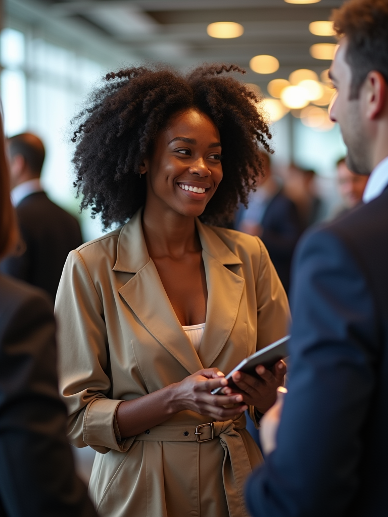 determined model wearing contemporary jumpsuit or fashionable separates networking at a tech conference, professional casual attire, engaged in conversation