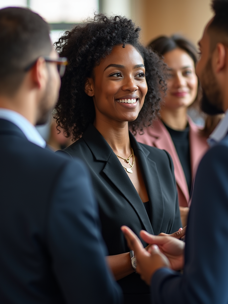 determined model wearing contemporary jumpsuit or fashionable separates networking at a tech conference, professional casual attire, engaged in conversation