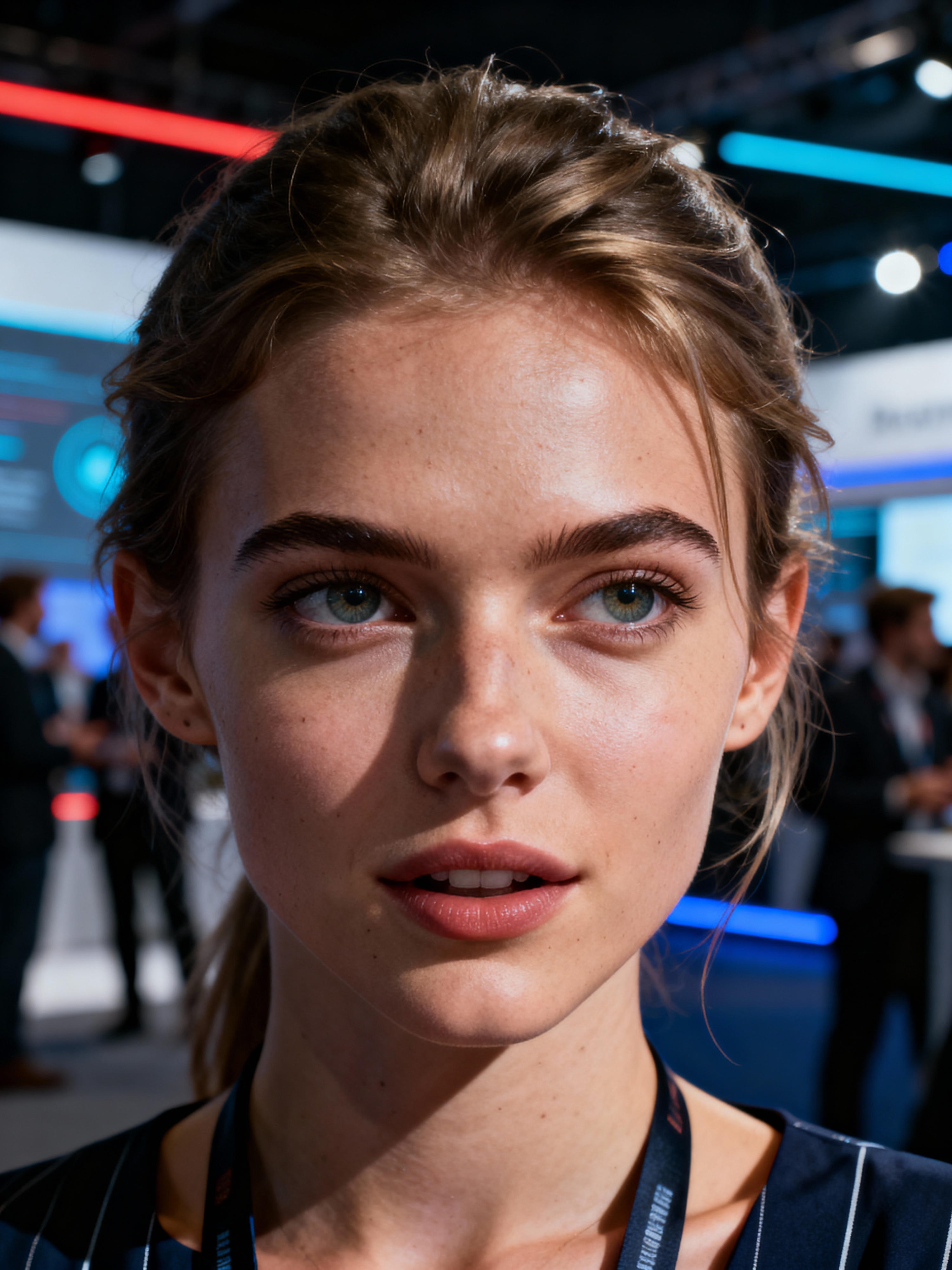 determined model wearing contemporary jumpsuit or fashionable separates networking at a tech conference, professional casual attire, engaged in conversation