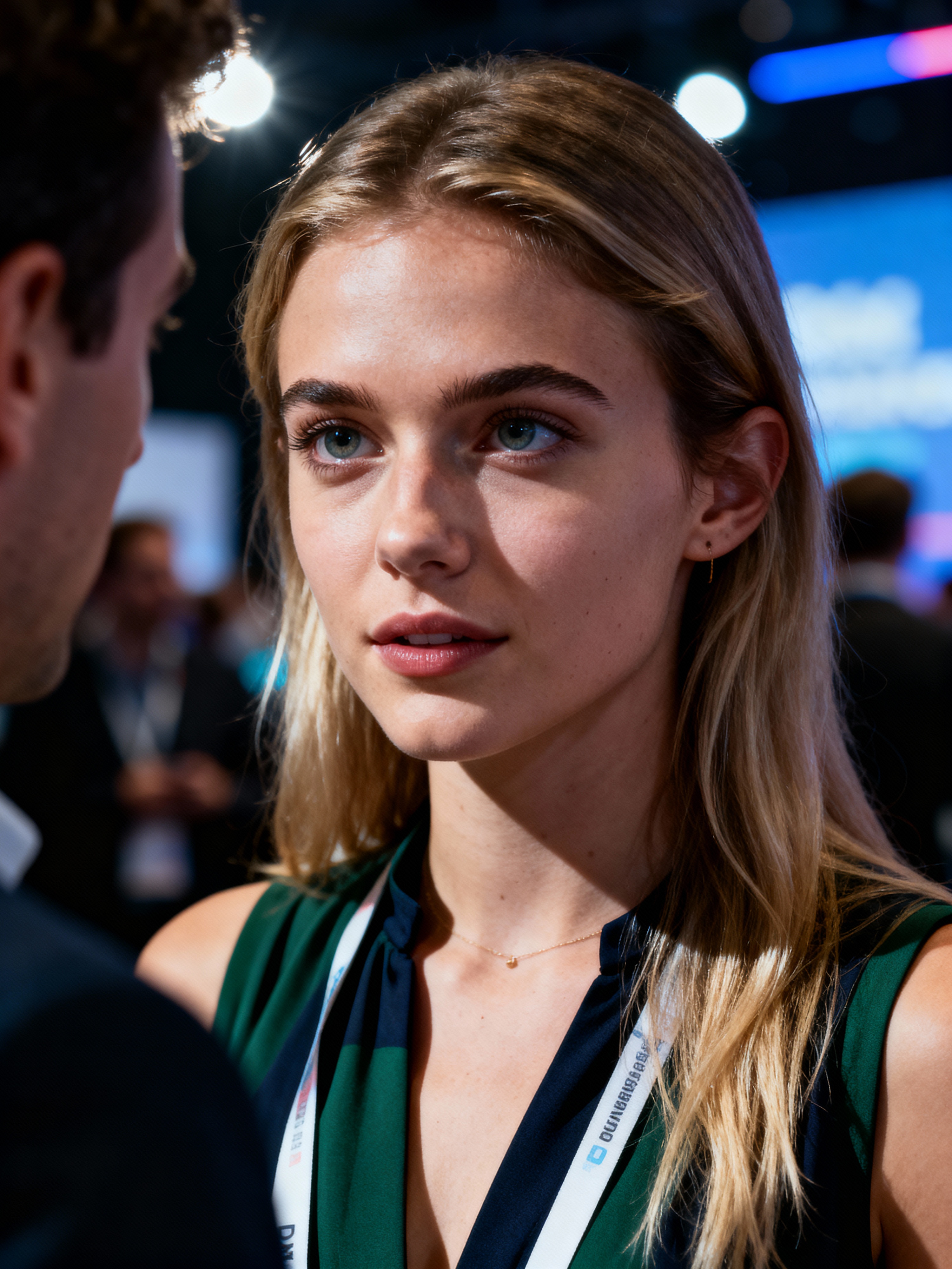 determined model wearing contemporary jumpsuit or fashionable separates networking at a tech conference, professional casual attire, engaged in conversation