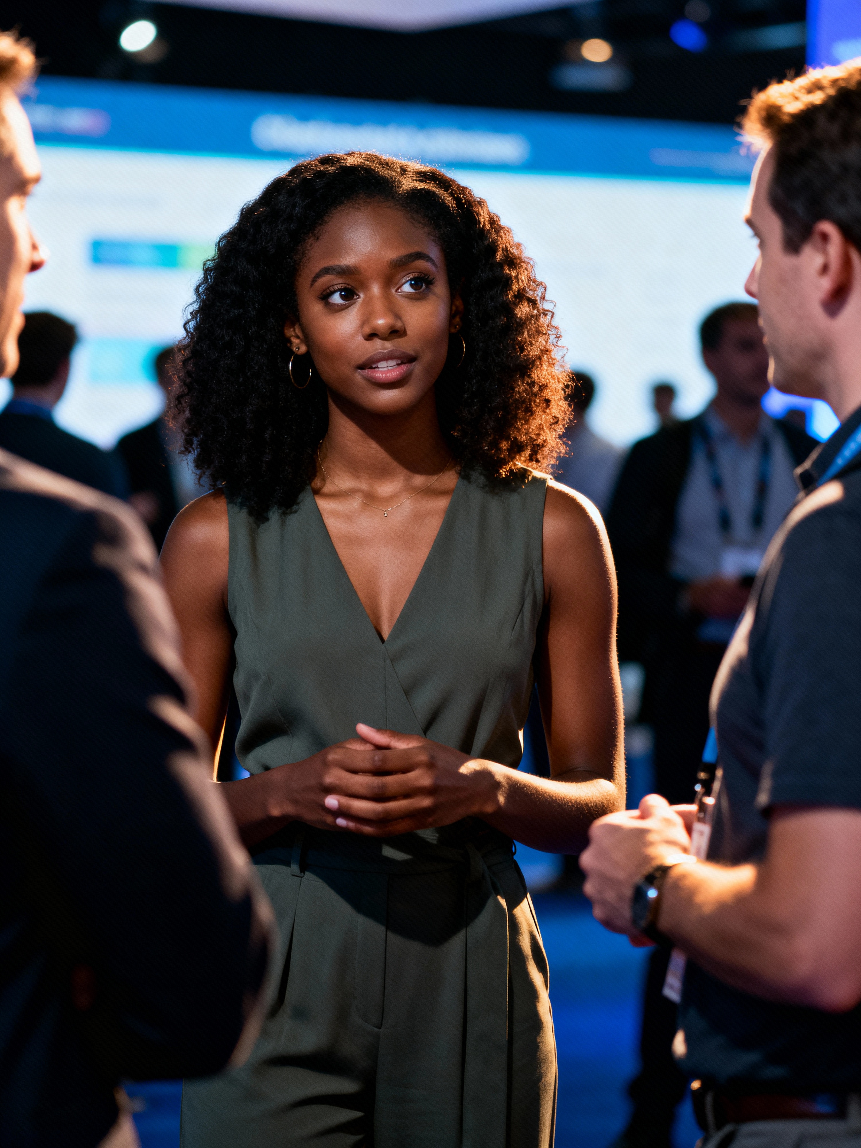 determined model wearing contemporary jumpsuit or fashionable separates networking at a tech conference, professional casual attire, engaged in conversation