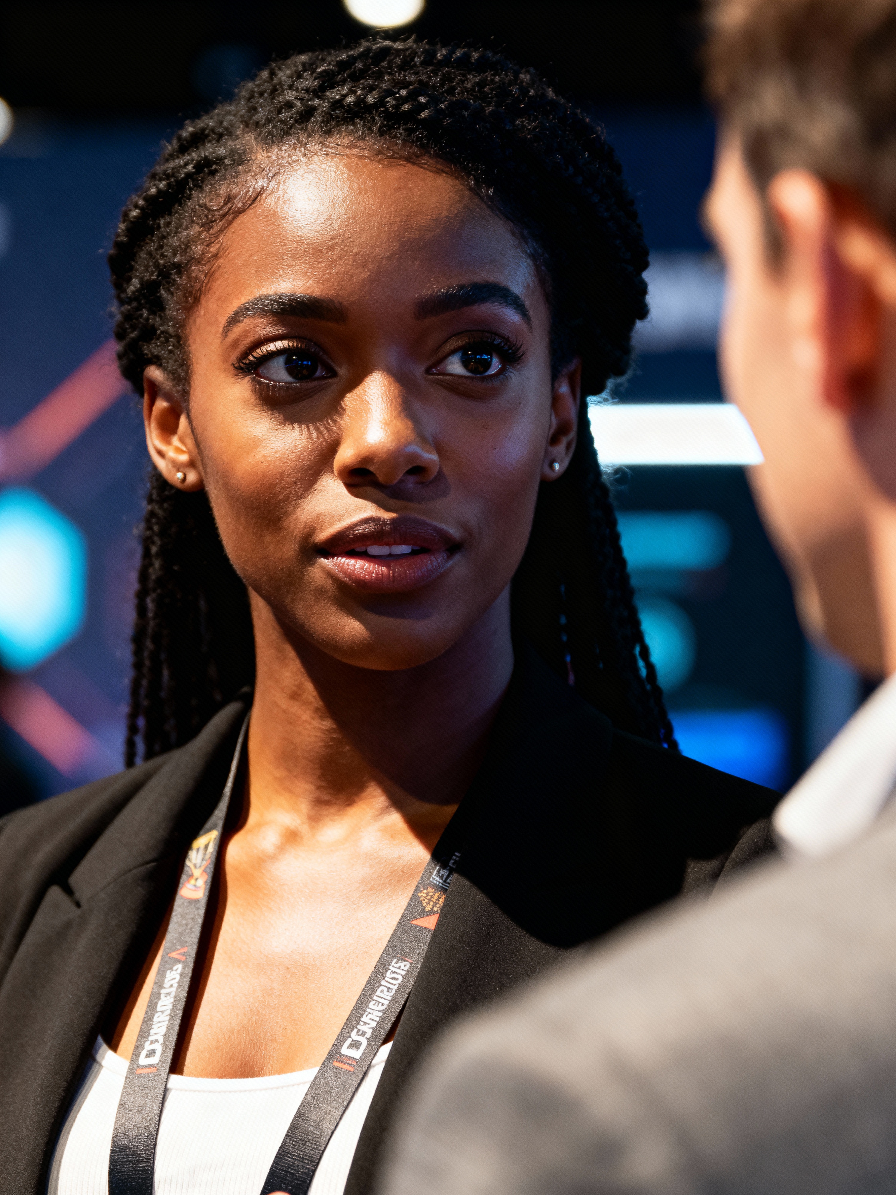 determined model wearing contemporary jumpsuit or fashionable separates networking at a tech conference, professional casual attire, engaged in conversation
