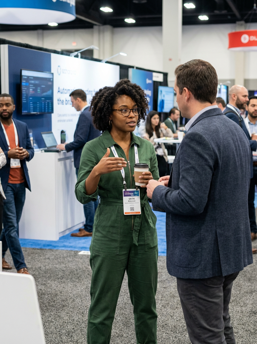 determined model wearing contemporary jumpsuit or fashionable separates networking at a tech conference, professional casual attire, engaged in conversation