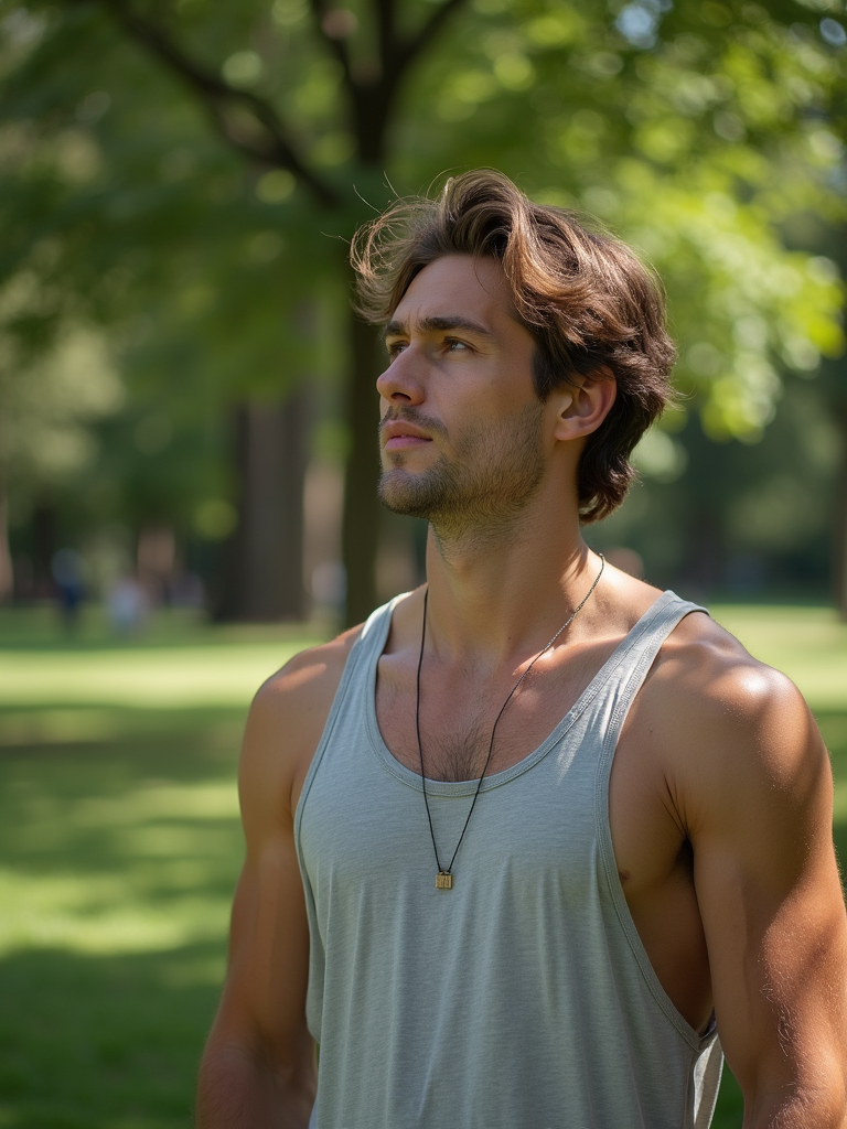 down-to-earth masculine model hanging out in a quiet park, enjoying nature