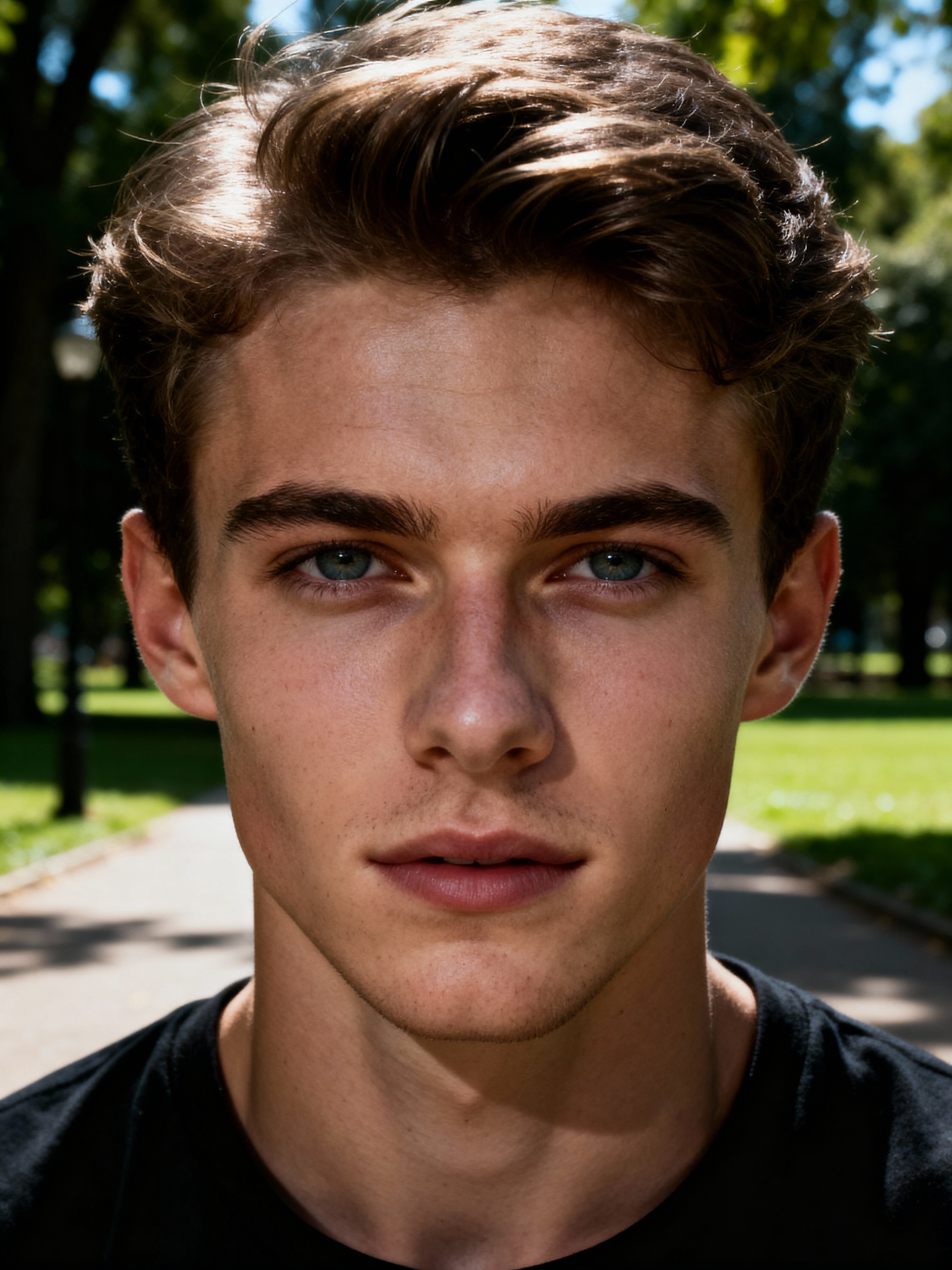 down-to-earth masculine model hanging out in a quiet park, enjoying nature