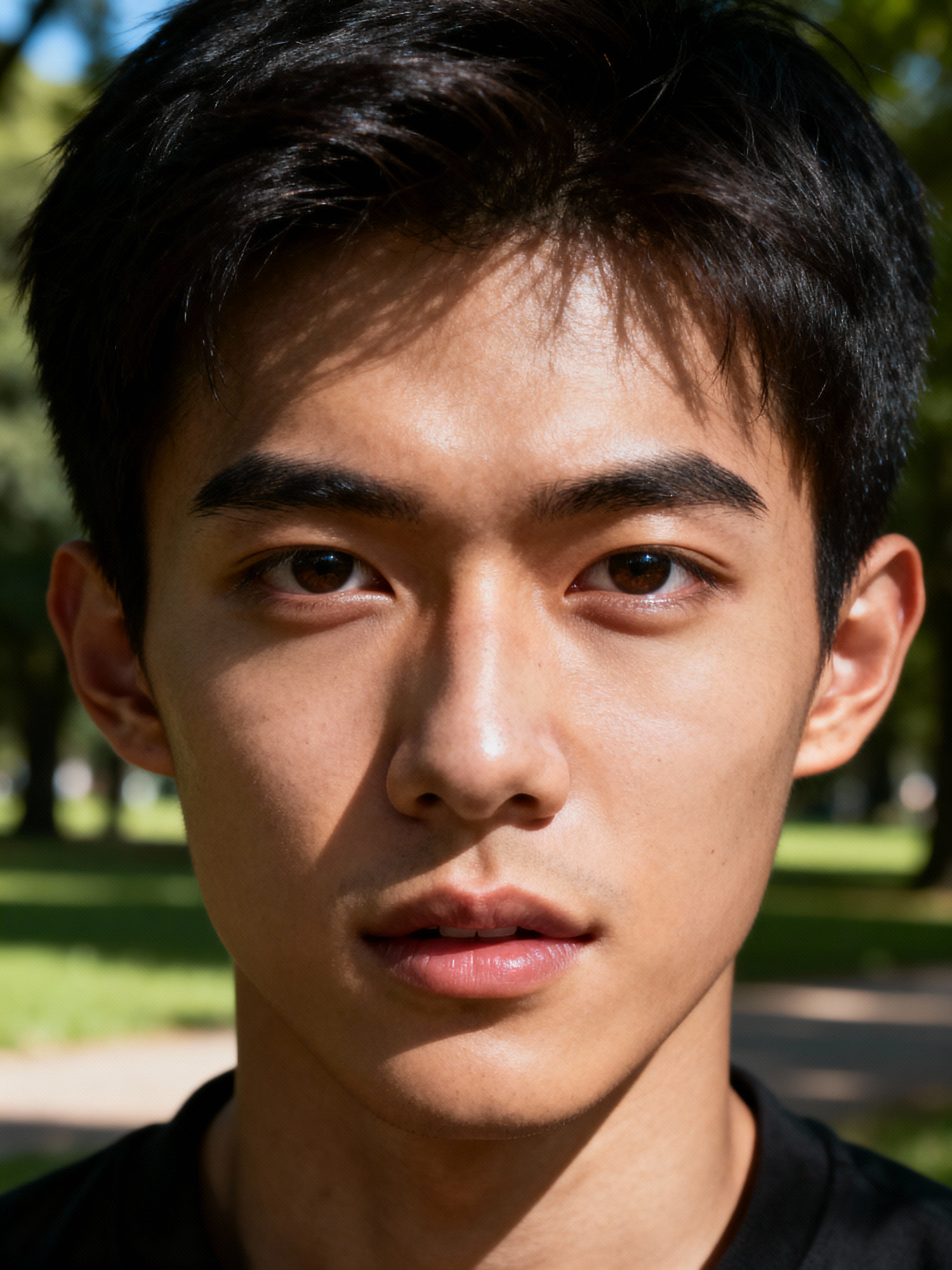 down-to-earth masculine model hanging out in a quiet park, enjoying nature