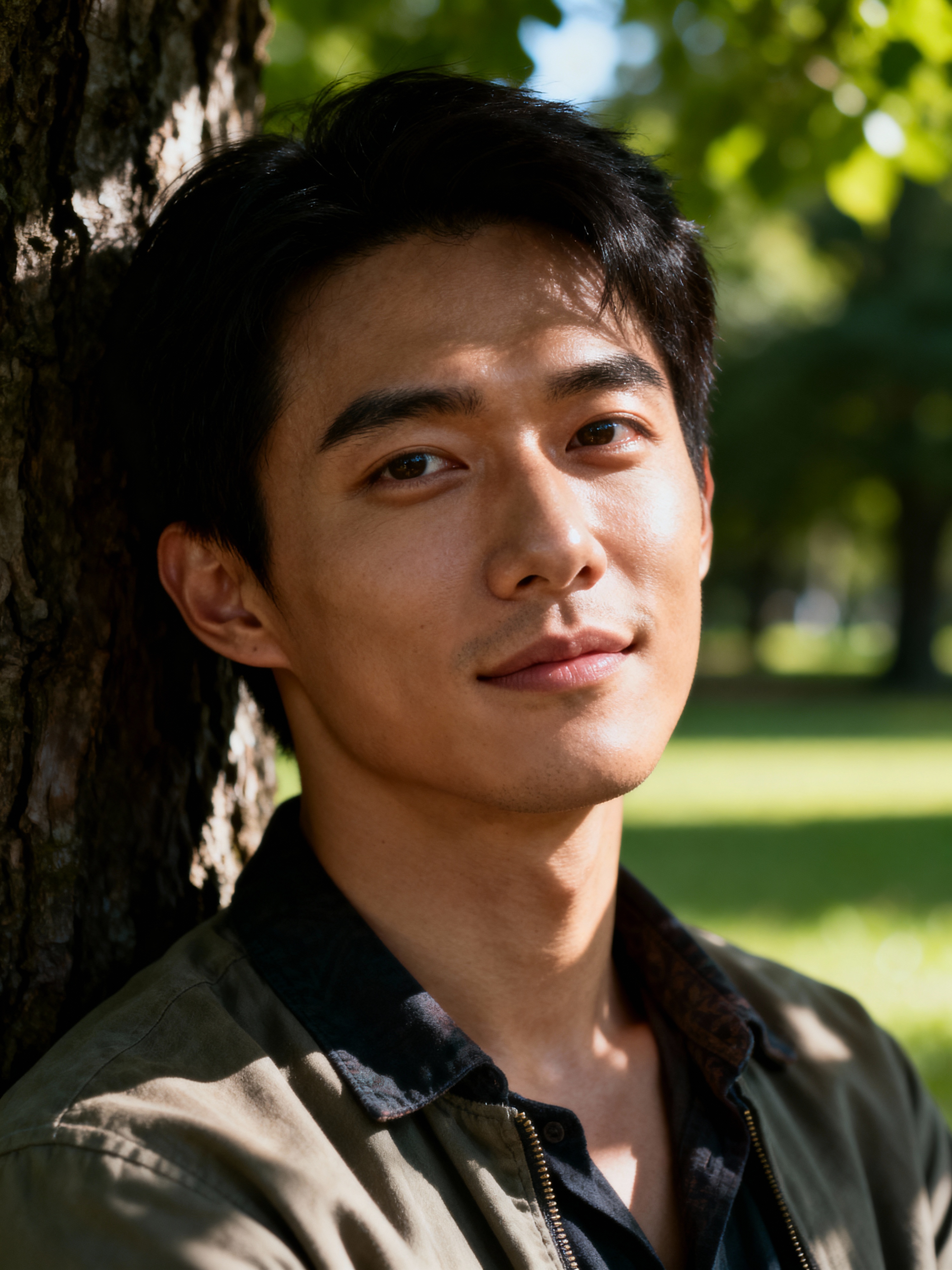 down-to-earth masculine model hanging out in a quiet park, enjoying nature