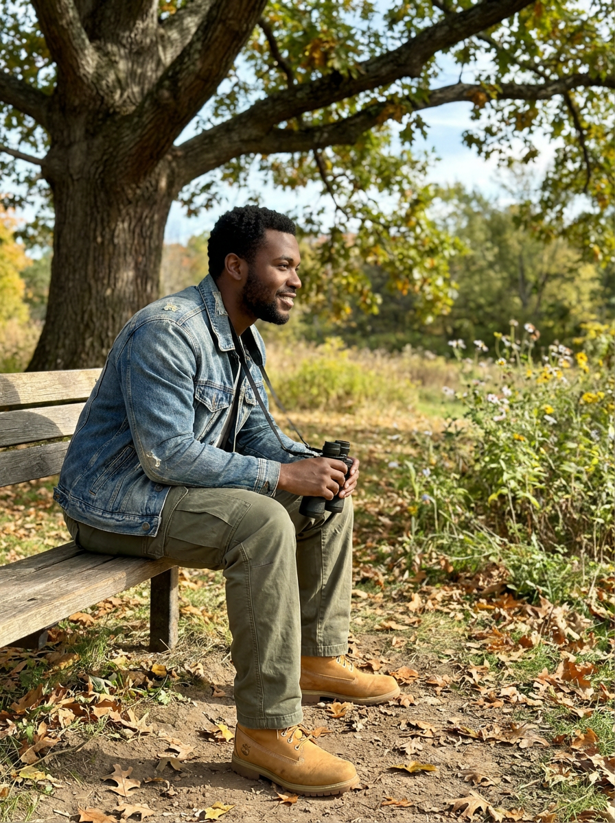 down-to-earth masculine model hanging out in a quiet park, enjoying nature