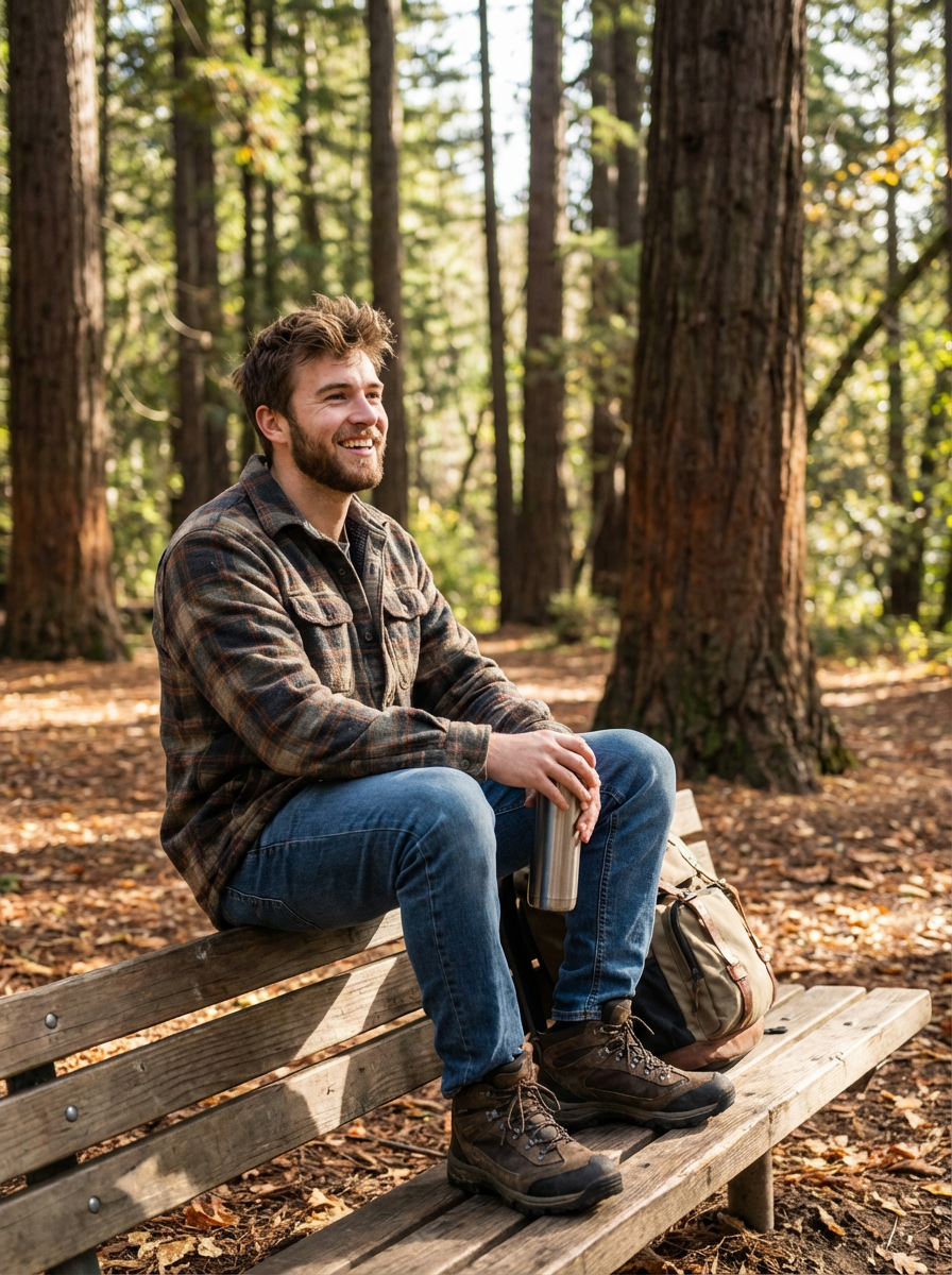 down-to-earth masculine model hanging out in a quiet park, enjoying nature