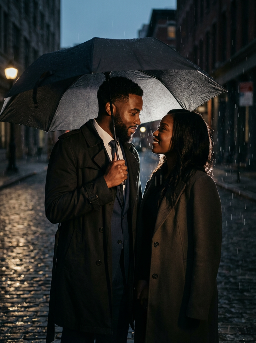 Dramatic engagement shoot in the rain. Model wearing a sharp trench coat and suit . Holding an umbrella, deep romantic gazes, moody lighting.