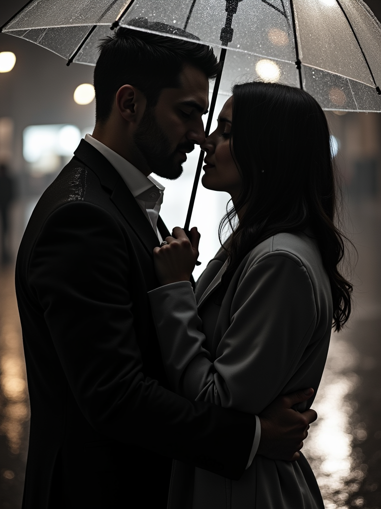 Dramatic engagement shoot in the rain. Wearing a sharp trench coat and suit . Holding an umbrella, deep romantic gazes, moody lighting.