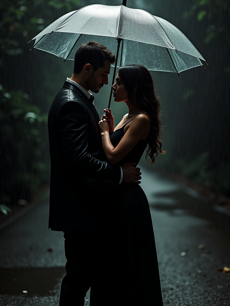 Dramatic engagement shoot in the rain. Wearing a sleek, long dress . Holding an umbrella, deep romantic gazes, moody lighting.