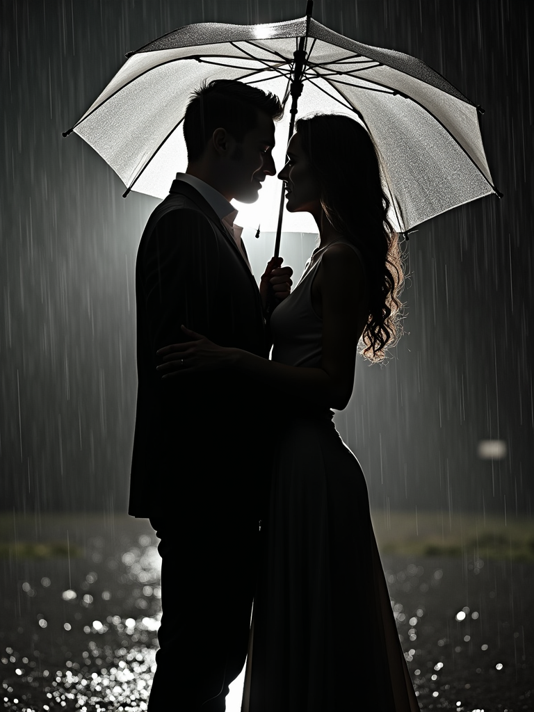 Dramatic engagement shoot in the rain. Wearing a sleek, long dress . Holding an umbrella, deep romantic gazes, moody lighting.
