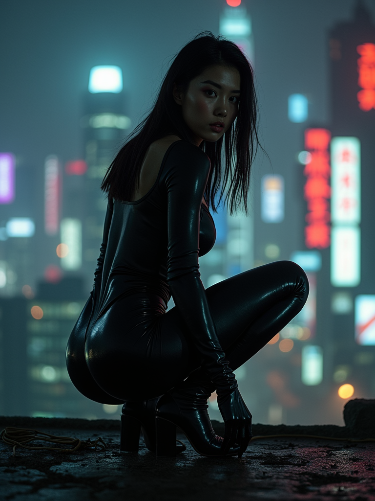 Dramatic night shot of a model in a sleek, skintight black bodysuit with glossy texture, crouching low on a gritty rooftop. A coiled whip rests in one gloved hand, while she glances over her shoulder with a sharp, feline-like gaze. The blurred cityscape behind her glows with neon signs and moonlight, casting long shadows and enhancing the moody, cinematic noir atmosphere.