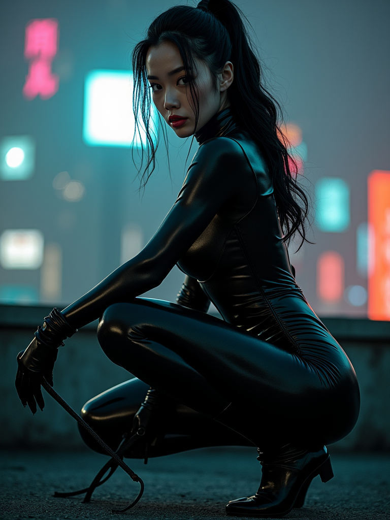 Dramatic night shot of a model in a sleek, skintight black bodysuit with glossy texture, crouching low on a gritty rooftop. A coiled whip rests in one gloved hand, while she glances over her shoulder with a sharp, feline-like gaze. The blurred cityscape behind her glows with neon signs and moonlight, casting long shadows and enhancing the moody, cinematic noir atmosphere.