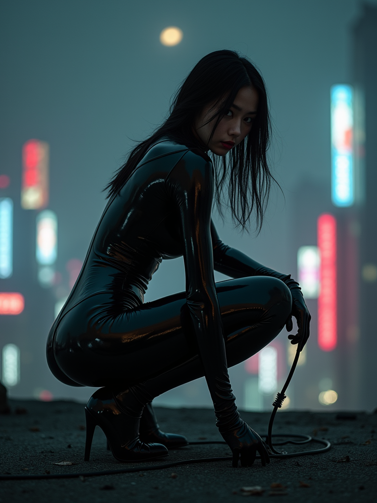 Dramatic night shot of a model in a sleek, skintight black bodysuit with glossy texture, crouching low on a gritty rooftop. A coiled whip rests in one gloved hand, while she glances over her shoulder with a sharp, feline-like gaze. The blurred cityscape behind her glows with neon signs and moonlight, casting long shadows and enhancing the moody, cinematic noir atmosphere.