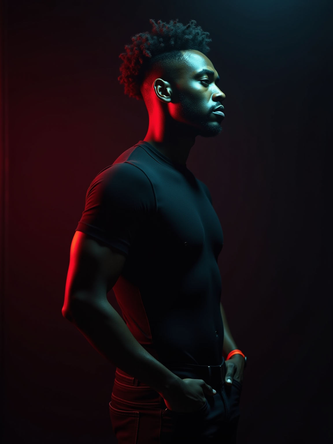 Dramatic studio portrait of a confident model, looking over their shoulder. Wearing a form-fitting black outfit. The lighting is intense and cinematic, with strong red and teal color contrast illuminating their hair and skin, casting moody shadows. The background is dark and atmospheric