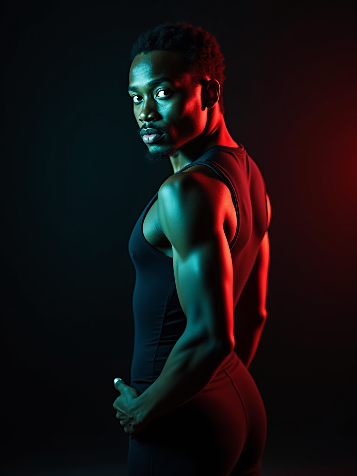 Dramatic studio portrait of a confident model, looking over their shoulder. Wearing a form-fitting black outfit. The lighting is intense and cinematic, with strong red and teal color contrast illuminating their hair and skin, casting moody shadows. The background is dark and atmospheric
