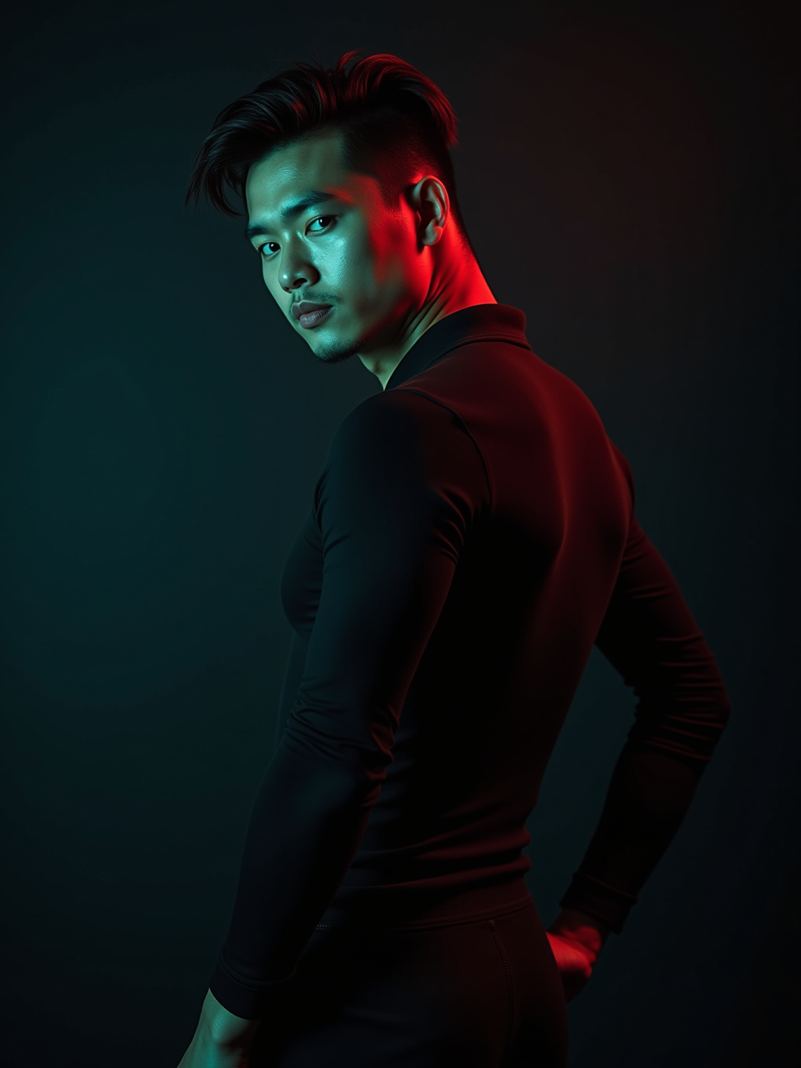 Dramatic studio portrait of a confident model, looking over their shoulder. Wearing a form-fitting black outfit. The lighting is intense and cinematic, with strong red and teal color contrast illuminating their hair and skin, casting moody shadows. The background is dark and atmospheric