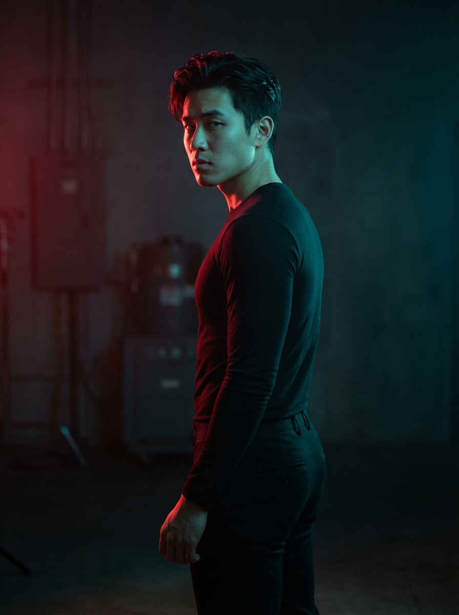 Dramatic studio portrait of a confident model, looking over their shoulder. Wearing a form-fitting black outfit. The lighting is intense and cinematic, with strong red and teal color contrast illuminating their hair and skin, casting moody shadows. The background is dark and atmospheric