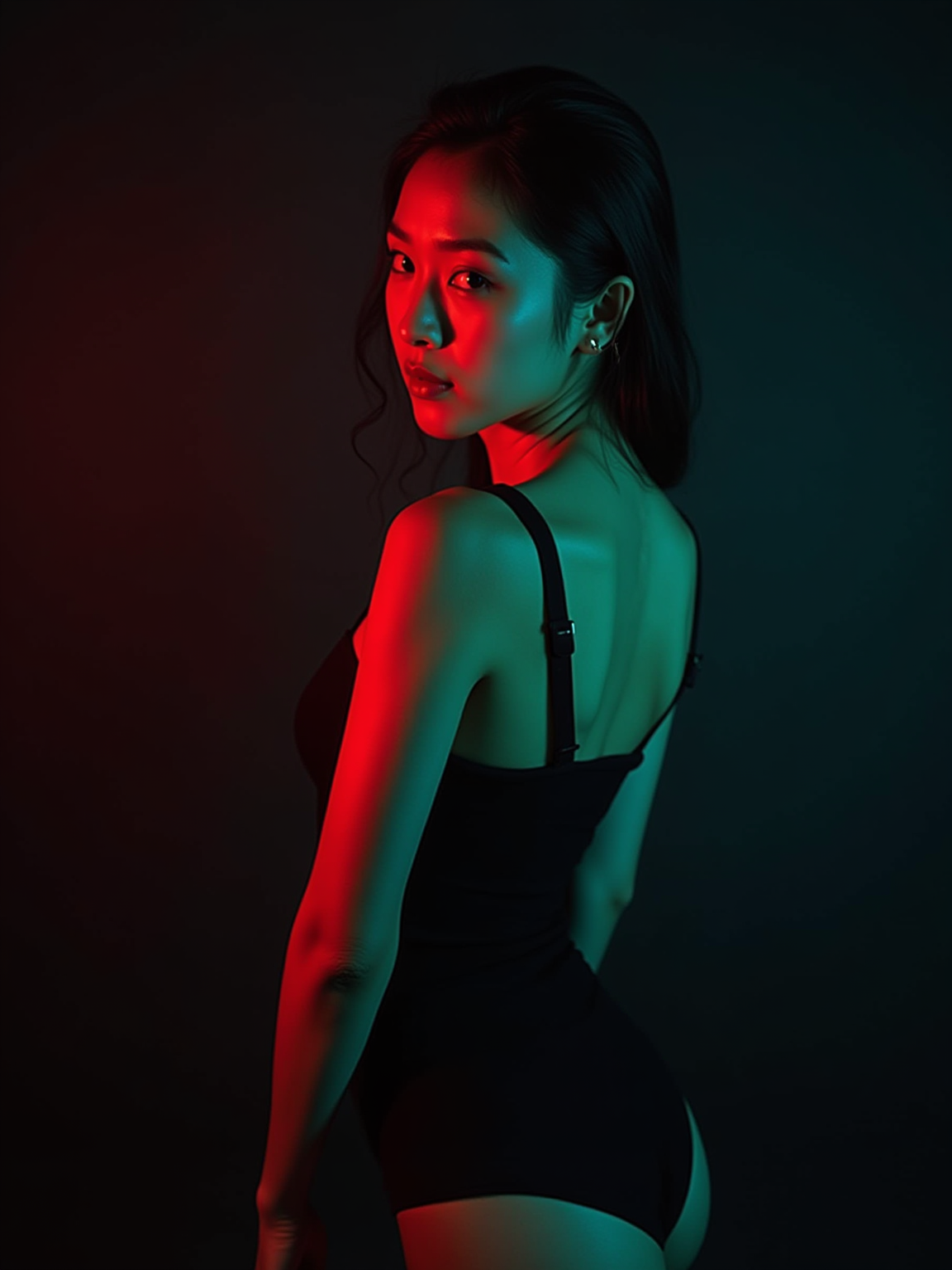 Dramatic studio portrait of a confident model, looking over their shoulder. Wearing a form-fitting black outfit. The lighting is intense and cinematic, with strong red and teal color contrast illuminating their hair and skin, casting moody shadows. The background is dark and atmospheric