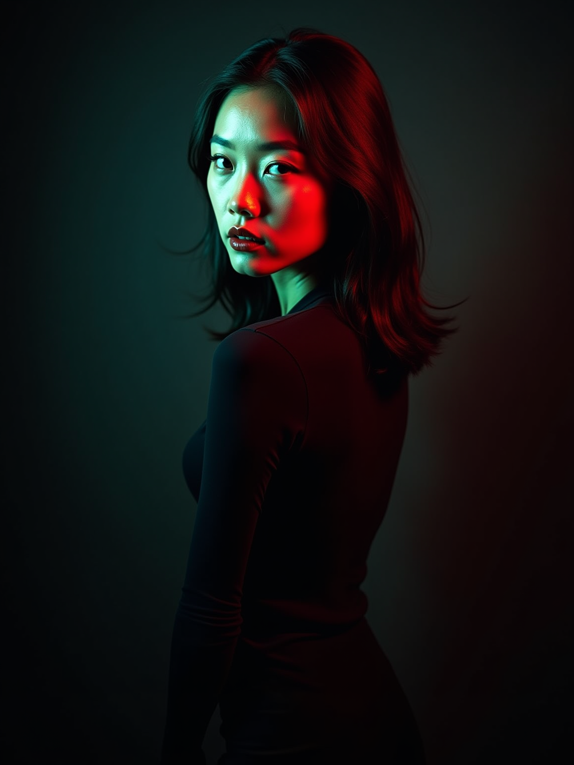 Dramatic studio portrait of a confident model, looking over their shoulder. Wearing a form-fitting black outfit. The lighting is intense and cinematic, with strong red and teal color contrast illuminating their hair and skin, casting moody shadows. The background is dark and atmospheric