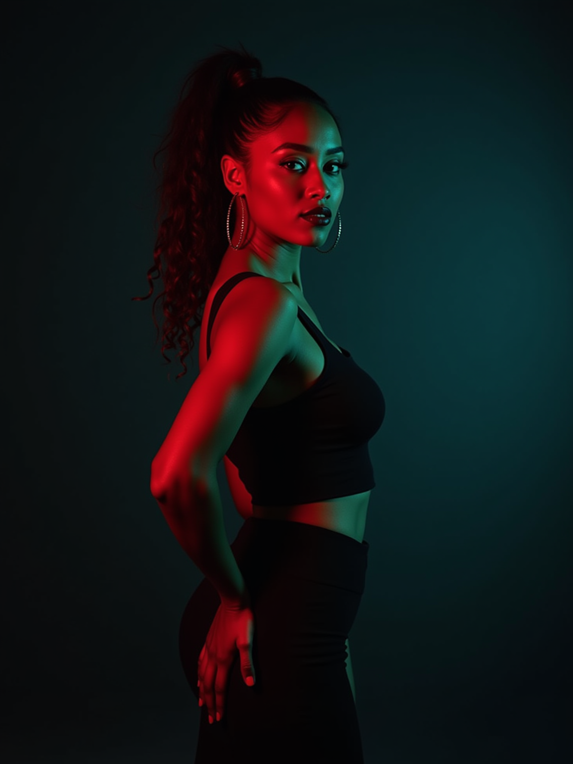 Dramatic studio portrait of a confident model, looking over their shoulder. Wearing a form-fitting black outfit. The lighting is intense and cinematic, with strong red and teal color contrast illuminating their hair and skin, casting moody shadows. The background is dark and atmospheric