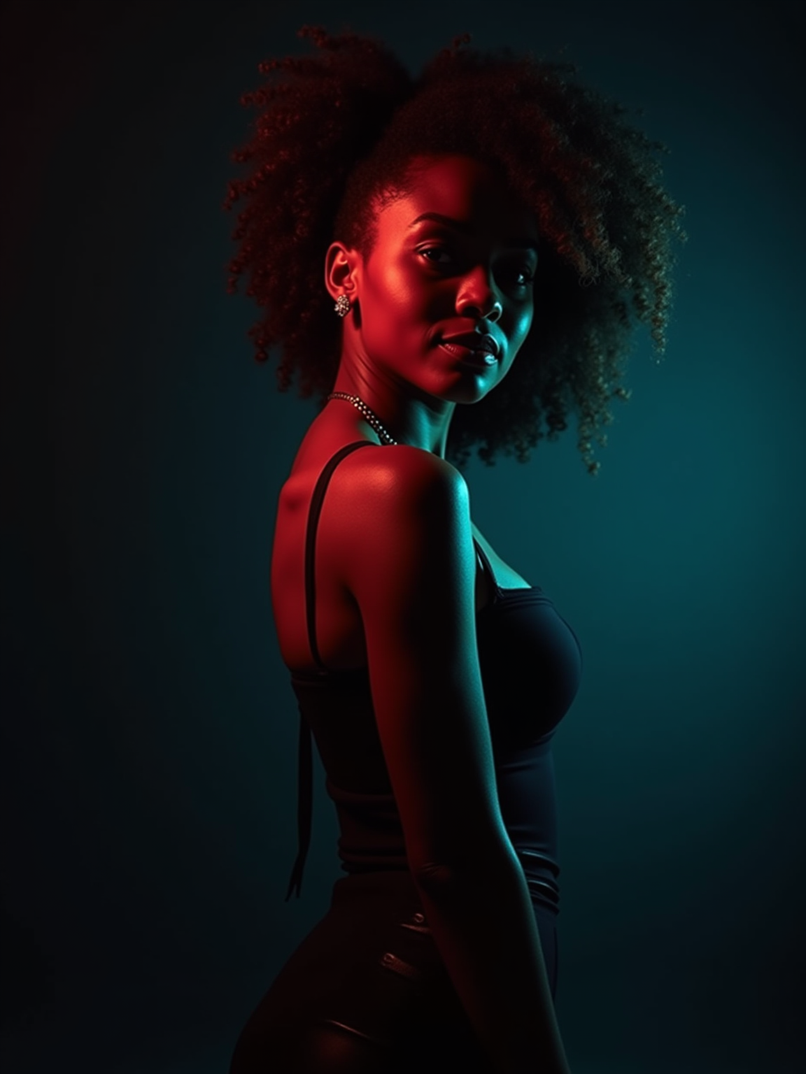Dramatic studio portrait of a confident model, looking over their shoulder. Wearing a form-fitting black outfit. The lighting is intense and cinematic, with strong red and teal color contrast illuminating their hair and skin, casting moody shadows. The background is dark and atmospheric