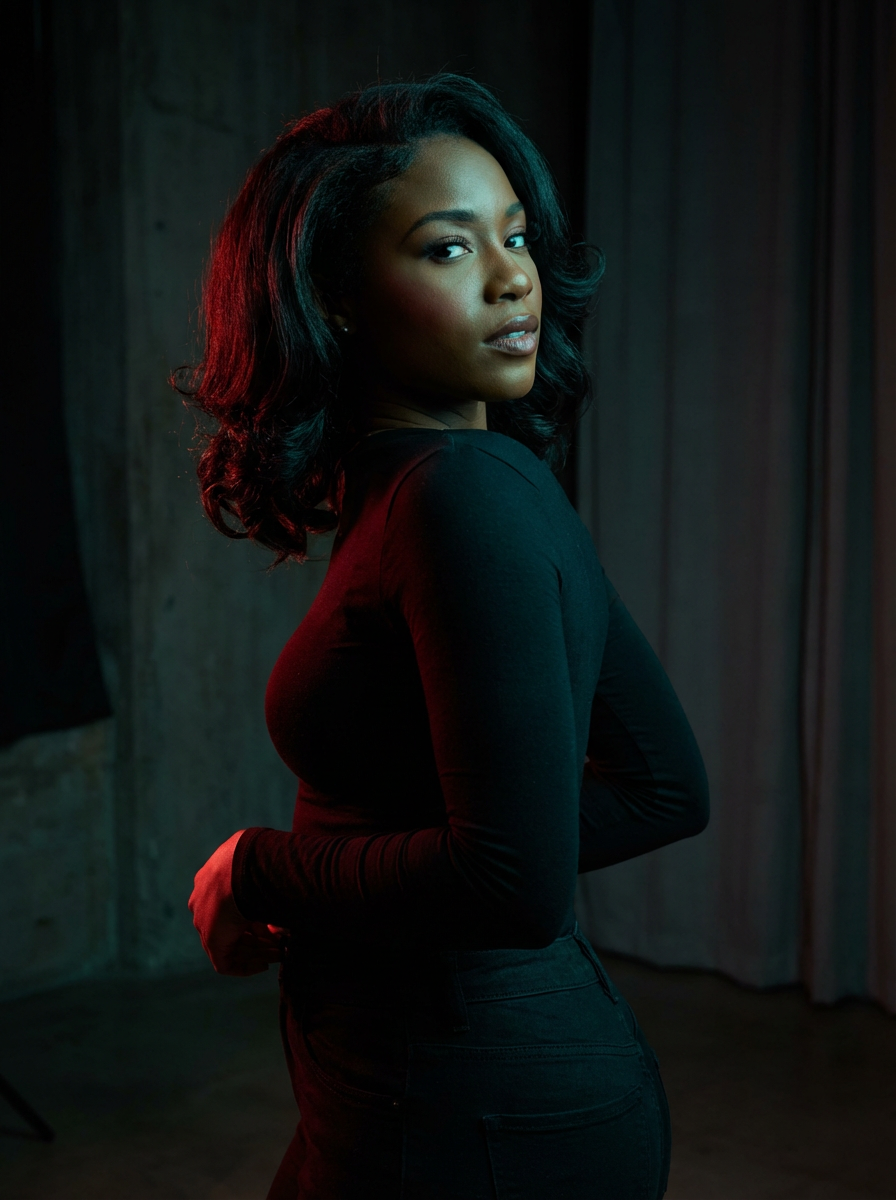Dramatic studio portrait of a confident model, looking over their shoulder. Wearing a form-fitting black outfit. The lighting is intense and cinematic, with strong red and teal color contrast illuminating their hair and skin, casting moody shadows. The background is dark and atmospheric