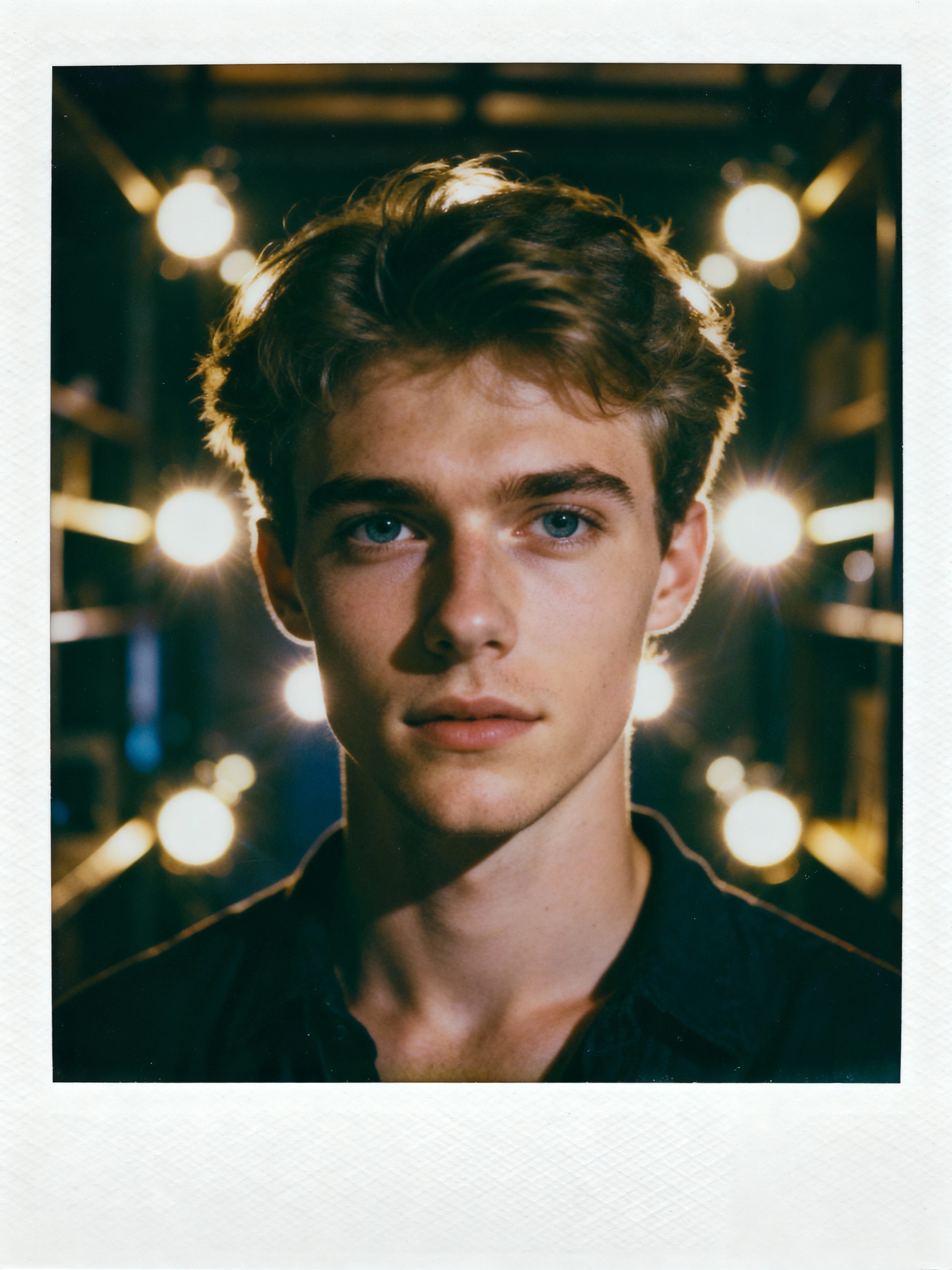 Dreamy polaroid instax photograph of model in the backrooms, many lights in background