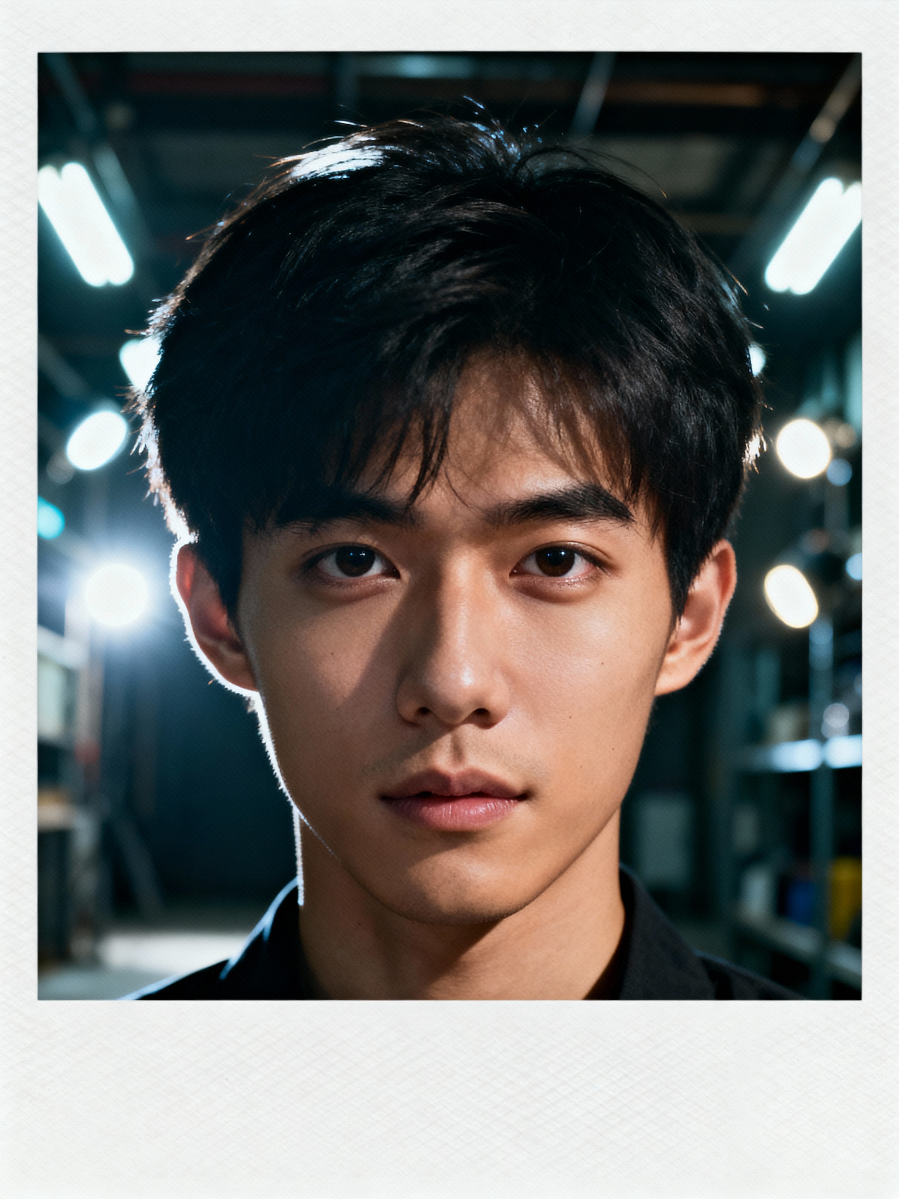 Dreamy polaroid instax photograph of model in the backrooms, many lights in background