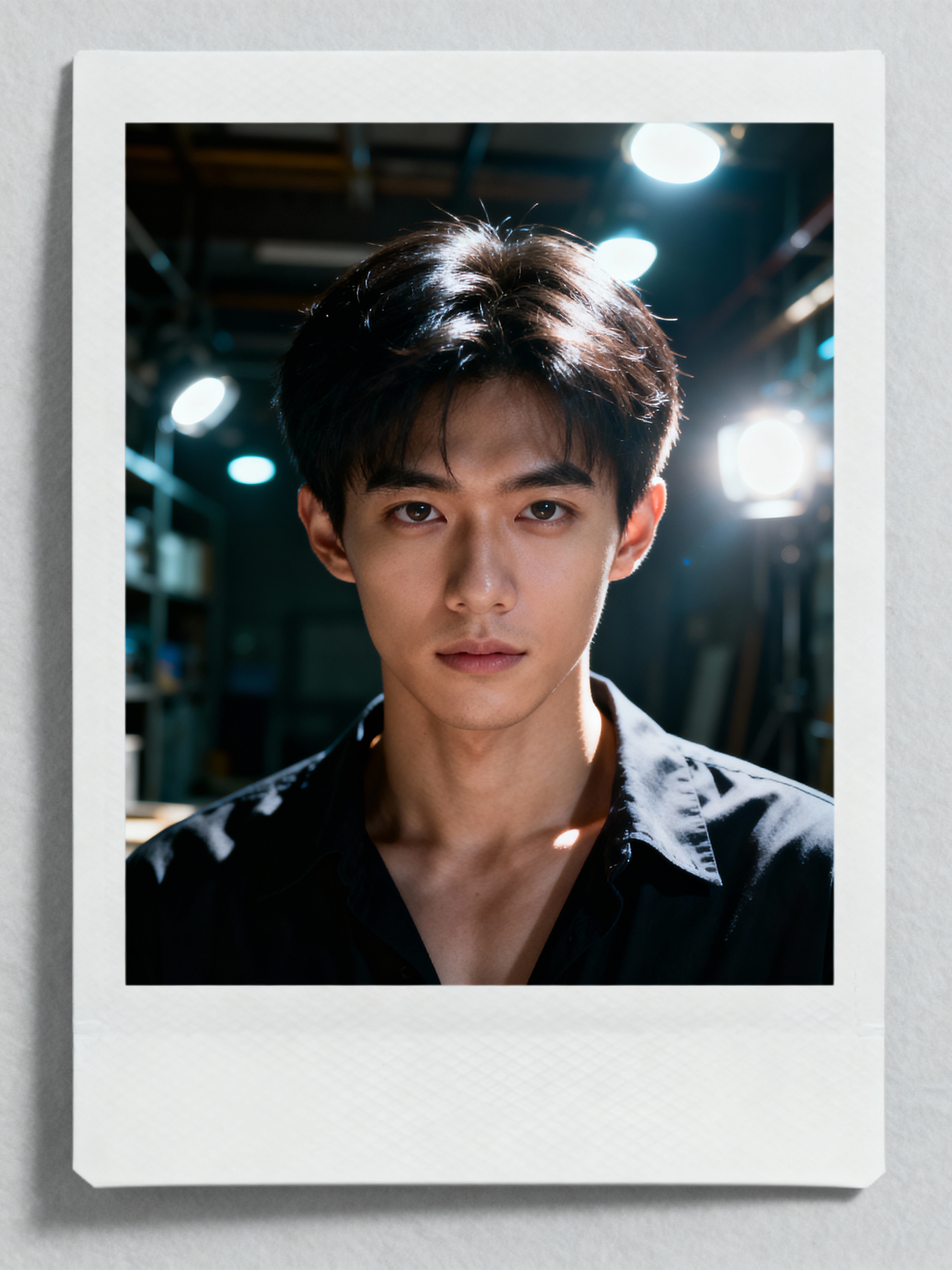 Dreamy polaroid instax photograph of model in the backrooms, many lights in background