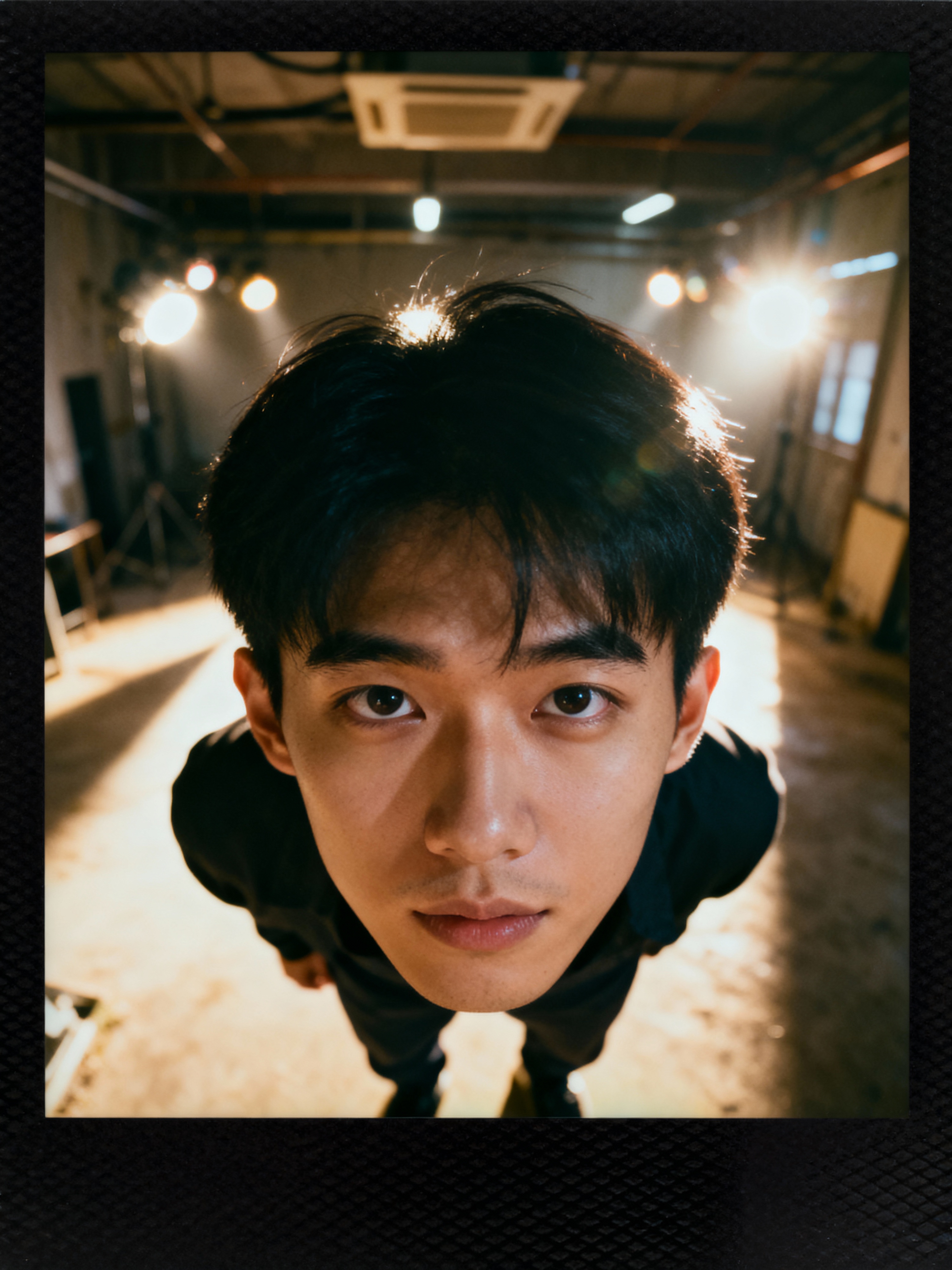Dreamy polaroid instax photograph of model in the backrooms, many lights in background
