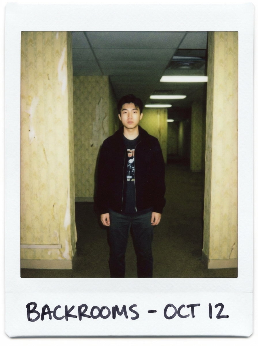 Dreamy polaroid instax photograph of model in the backrooms, many lights in background