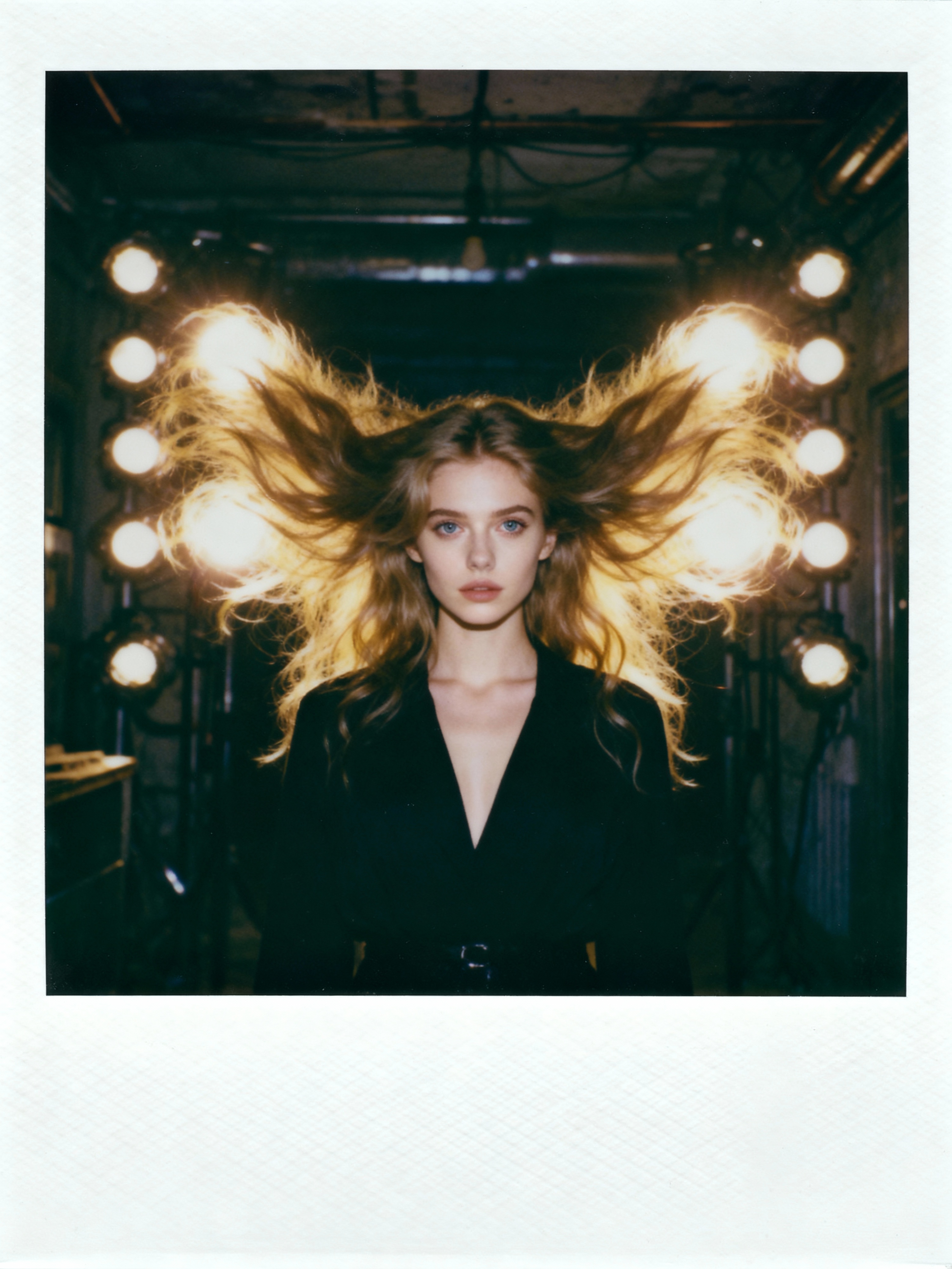Dreamy polaroid instax photograph of model in the backrooms, many lights in background