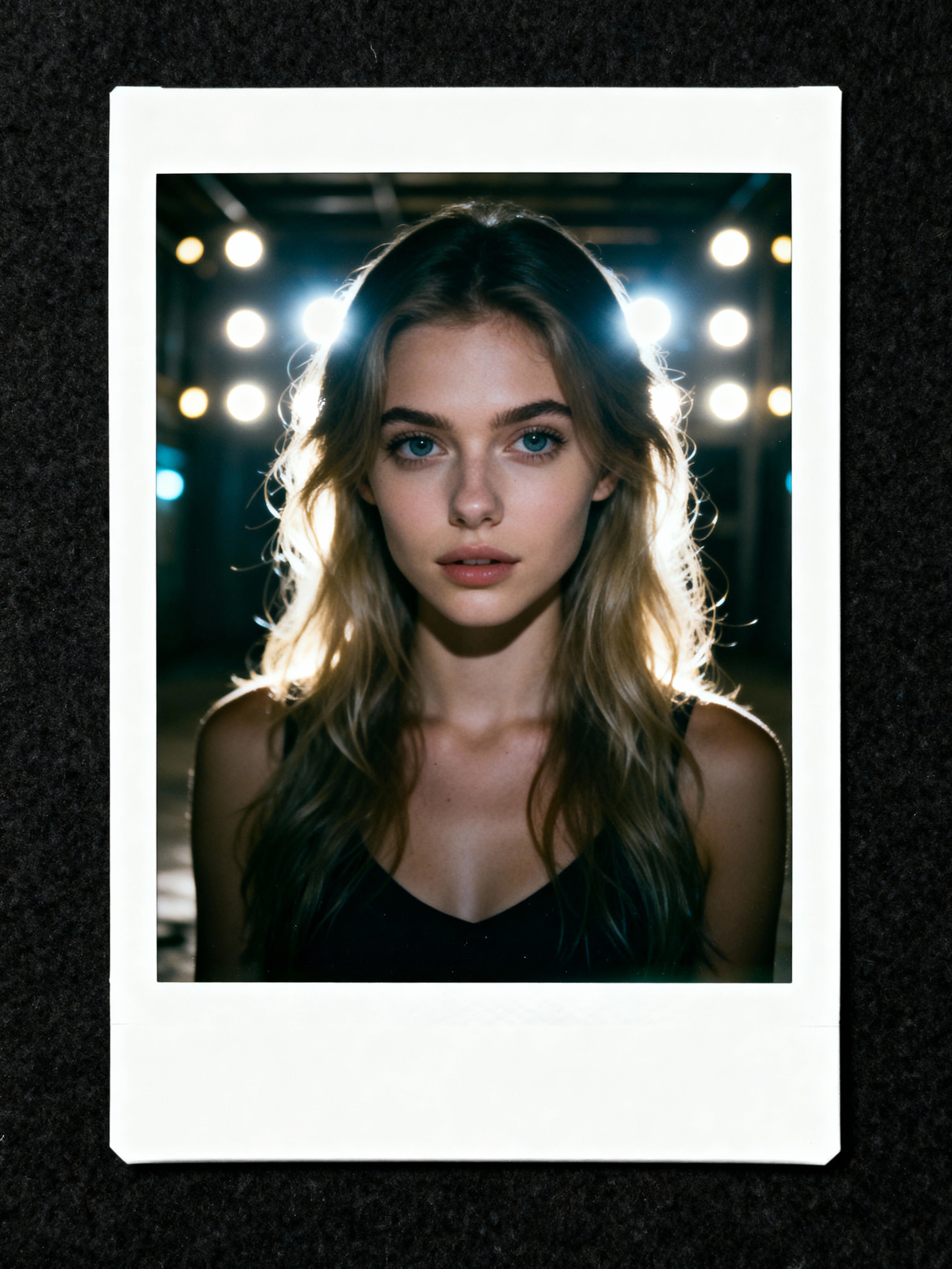 Dreamy polaroid instax photograph of model in the backrooms, many lights in background
