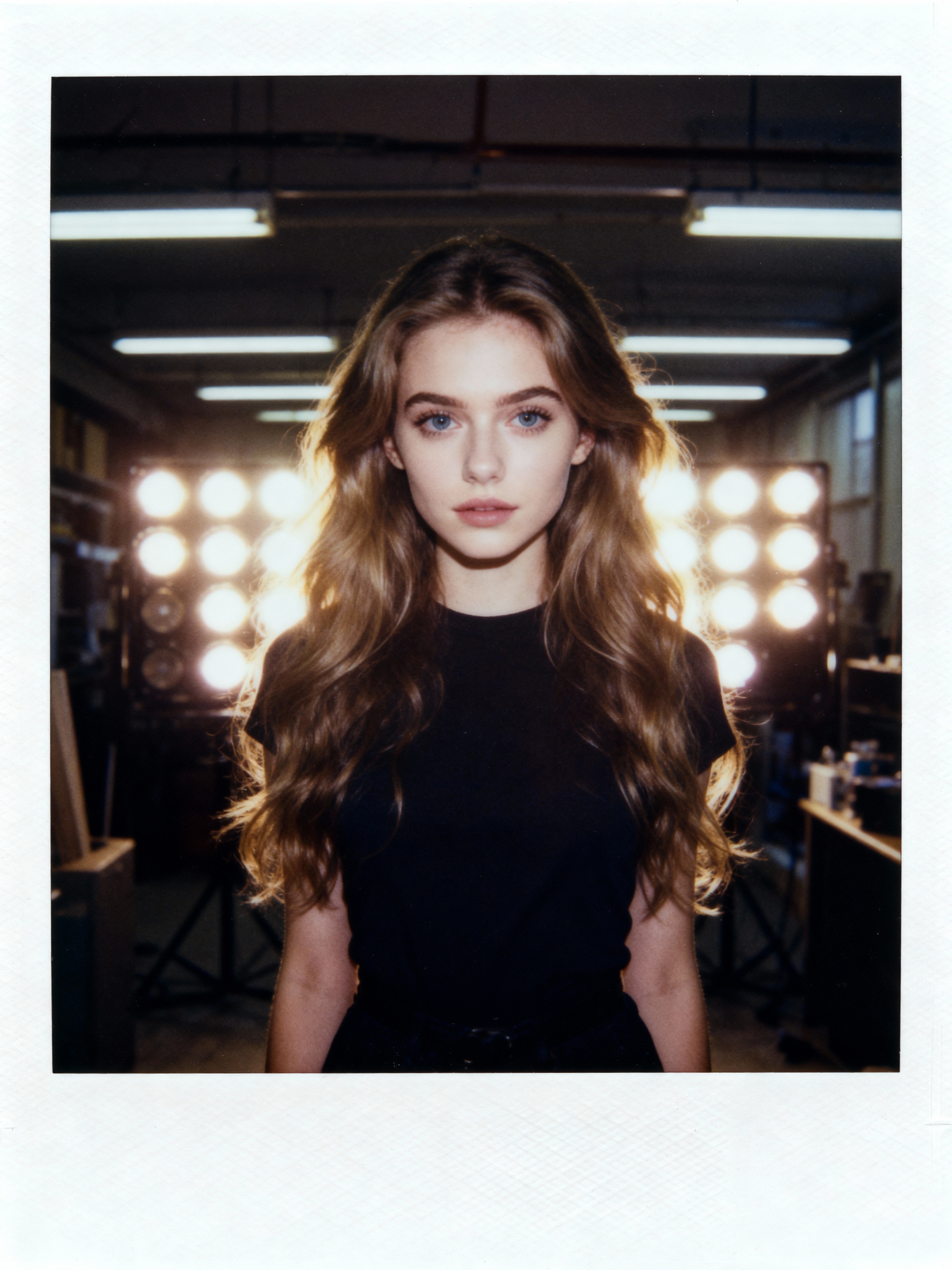 Dreamy polaroid instax photograph of model in the backrooms, many lights in background