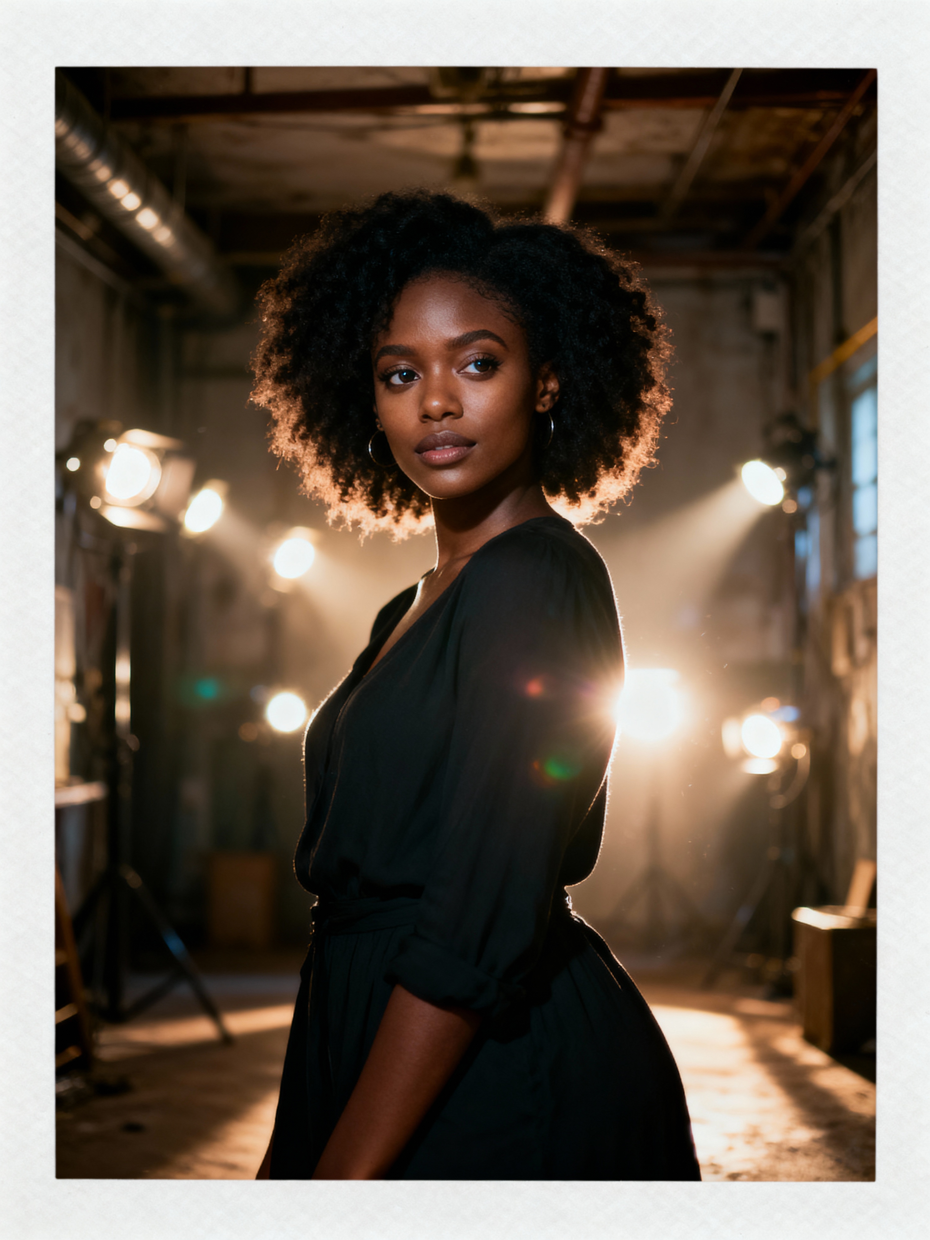Dreamy polaroid instax photograph of model in the backrooms, many lights in background