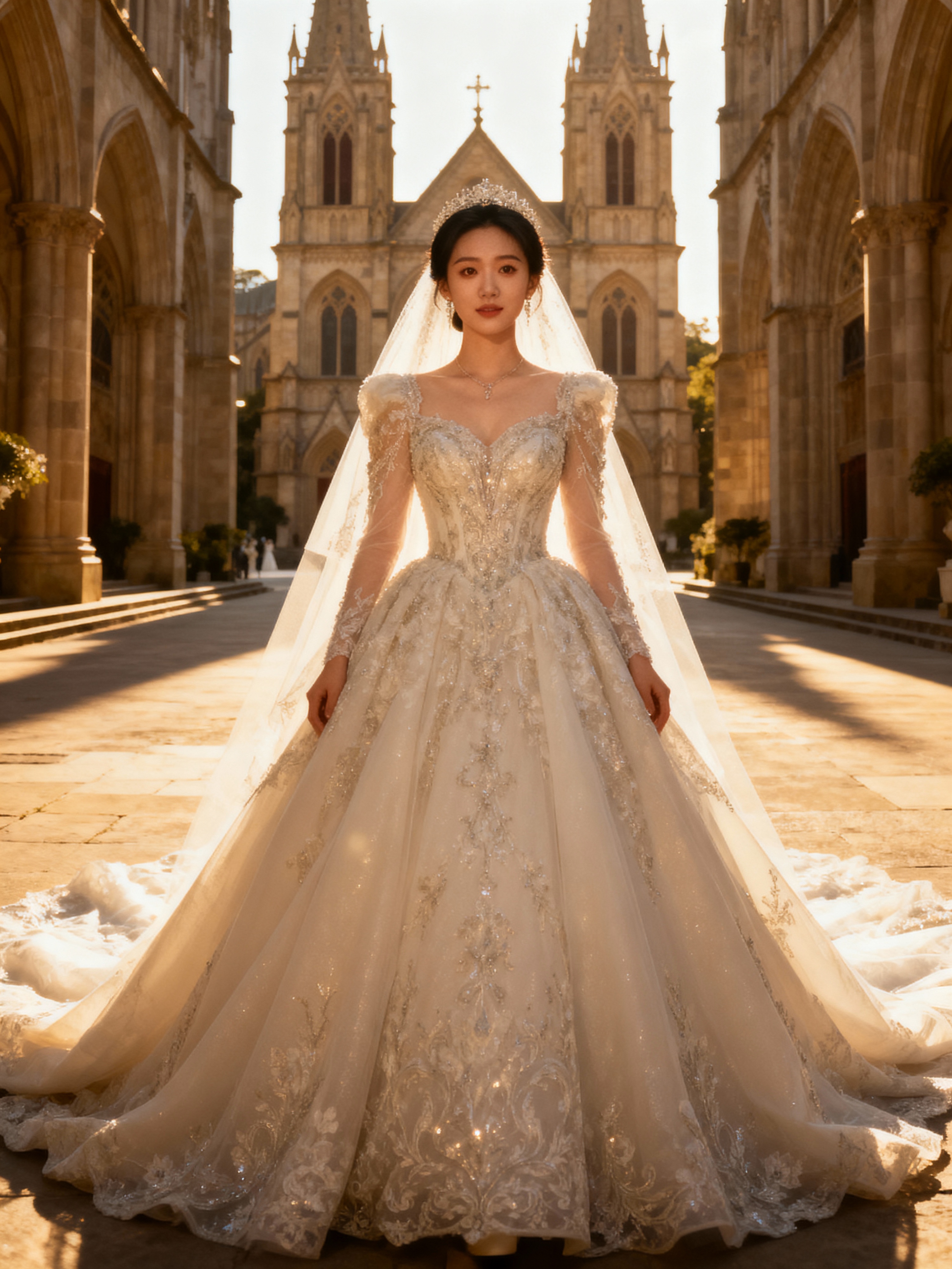 Dreamy wedding setting in front of a grand cathedral. Model wearing a regal long-train wedding dress . Romantic lighting and timeless aesthetic.