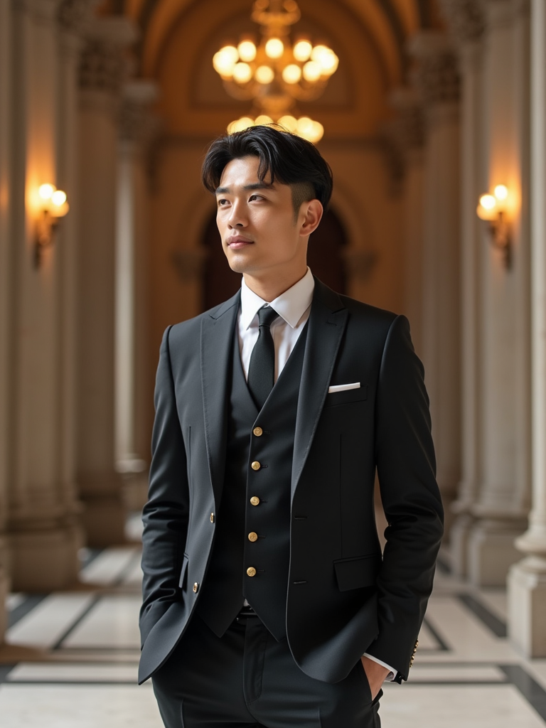 Dreamy wedding setting in front of a grand cathedral. Model wearing a sleek three-piece suit . Romantic lighting and timeless aesthetic.