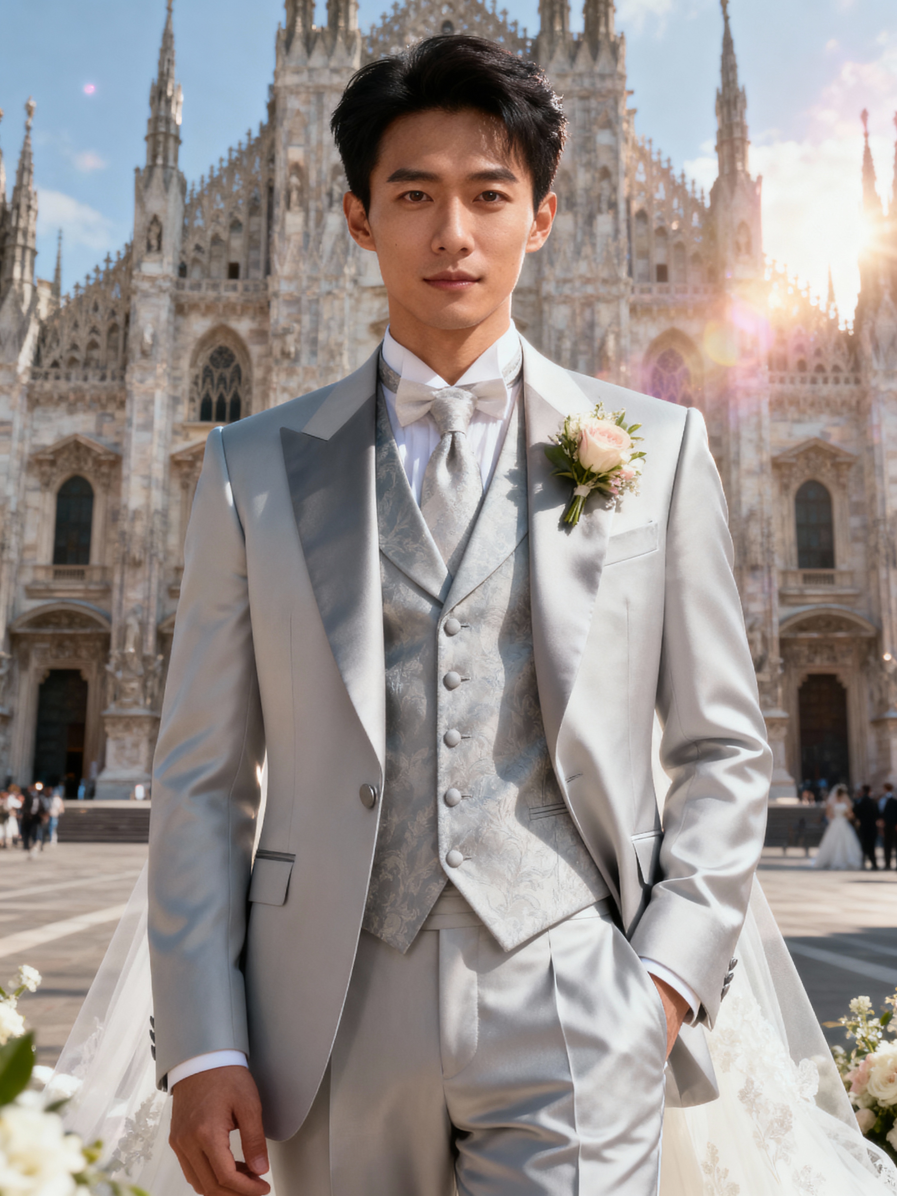 Dreamy wedding setting in front of a grand cathedral. Model wearing a sleek three-piece suit with boutonnière . Romantic lighting and timeless aesthetic.