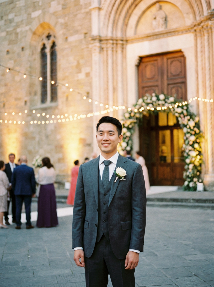 Dreamy wedding setting in front of a grand cathedral. Model wearing a sleek three-piece suit with boutonnière . Romantic lighting and timeless aesthetic.