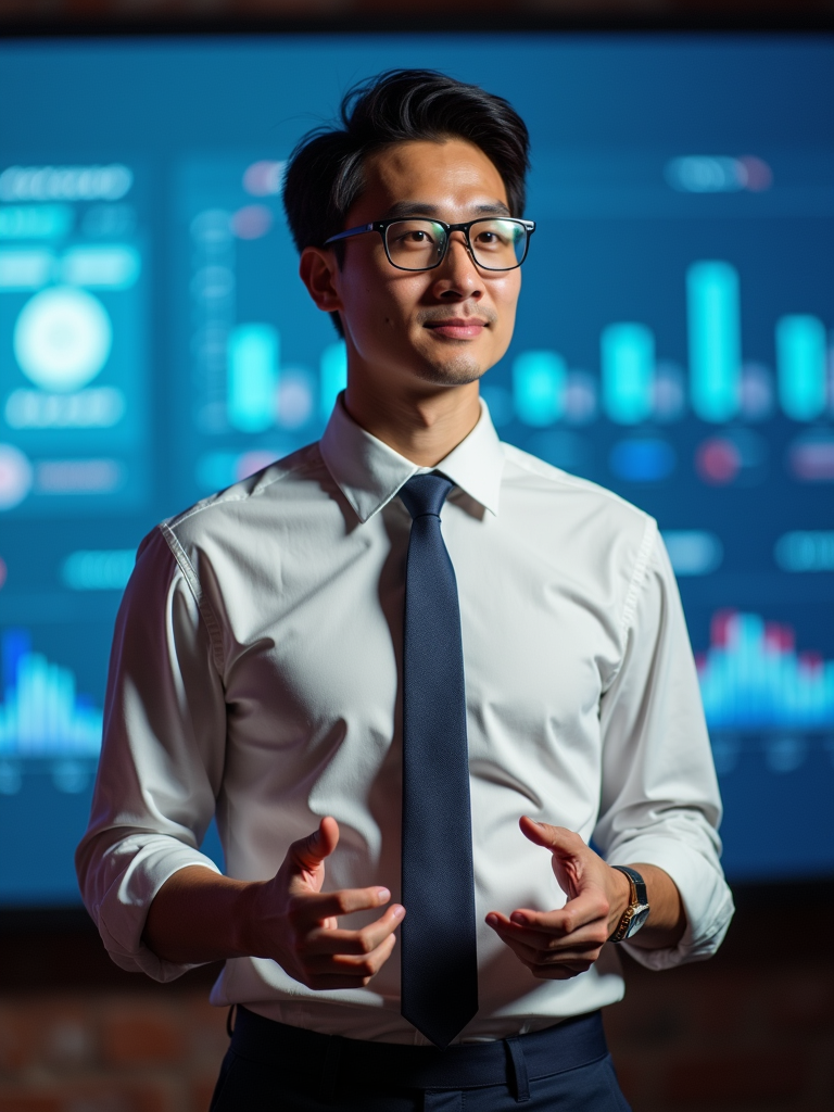 dynamic model dressed in contemporary button-up with no tie pitching to investors, presentation screen background, confident stance