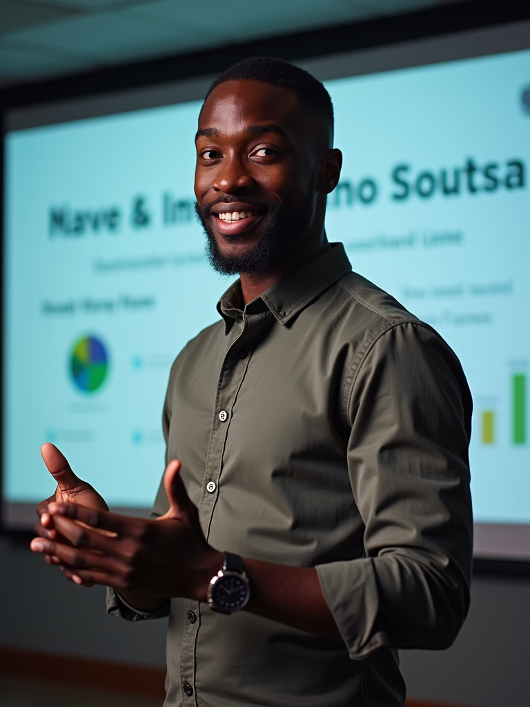 dynamic model dressed in contemporary button-up with no tie pitching to investors, presentation screen background, confident stance